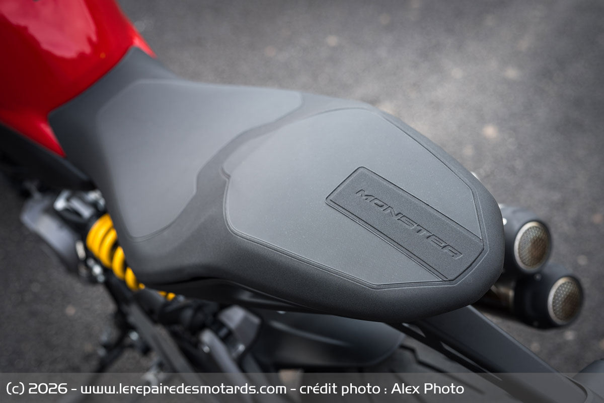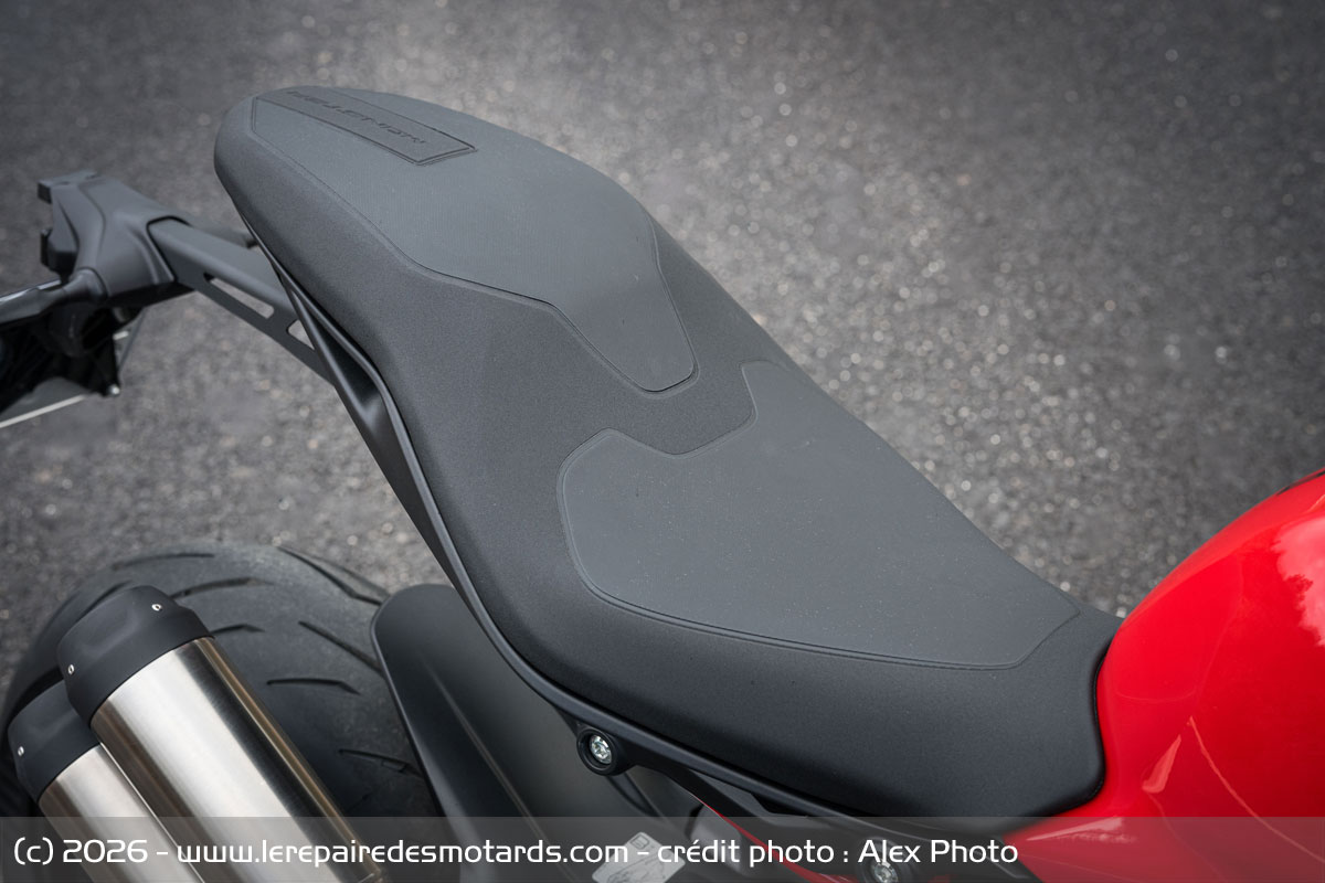Finesse encore avec les nouvelles écopes plus massives qui ne portent hélas plus les clignotants, relégués classiquement autour des tés de fourche. Mais elles intègrent désormais mieux les montants du radiateur. Sur le dessus du réservoir de 14 litres aux épaulements profilés et galbes sportifs, désormais symbole de la génération 2020, apparaissent à nouveau des entrées d’air dot l’ajour fait paraître des grilles plastifiées, évoquant la Monster 1100 evo. Sur le bidon s’appuient la selle monobloc et une boucle arrière largement remaniée.