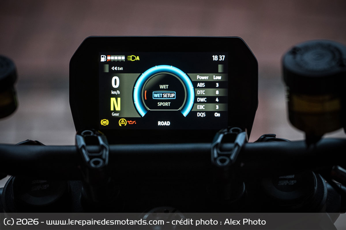 Cette vive mécanique est sous contrôle d’une large armée de puces. La centrale inertielle (trois axes six directions) régit à tout moment et sur l’angle le fonctionnement des assistances composant le DAVC (Ducati Advanced Vehicle Control). S’y notent l’ABS, le contrôle de traction (DTC) (8 niveaux /Off), celui du wheeling (DWC) (4 niveaux /Off) et du frein moteur (EBC) (3 Levels). Cinq profils de pilotage ajustent le comportement moteur et celui des assistances : Sport, Road, Urban et Pluie. Les quatre dernières réduisent la puissance à 95 ch. Leurs quatre modes de puissance dédiés (High, Medium, City et Low) peuvent être associés à un autre profil selon les préférences du pilote.