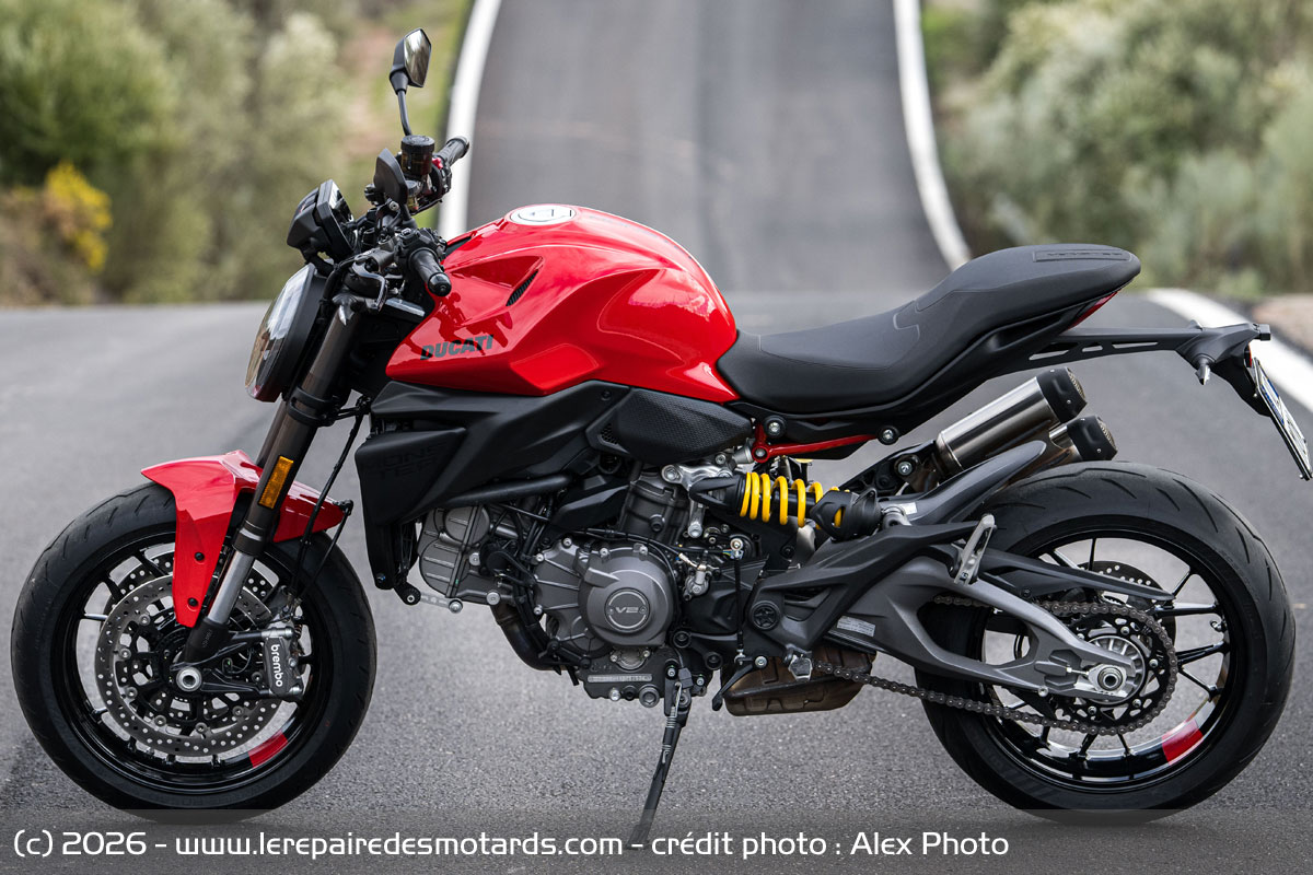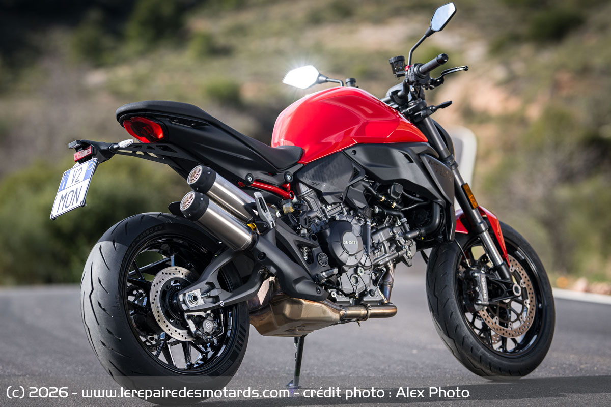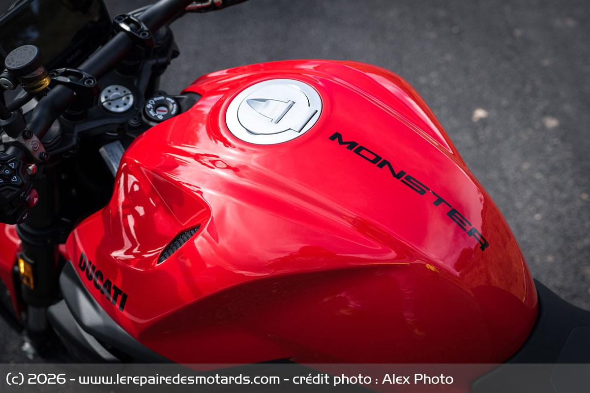 Plus honnête en style, toujours plus fine, la Ducati Monster perpétue sa réputation de machine épurée, authentique et de caractère. Son électronique de pointe et une géométrie de maître lui donnent des évolutions aussi justes qu’efficaces. À vérifier sur une virée plus en rapport avec ses prétentions. Tarifée 12 590 €, la Monster parait un peu couteuse, mais fait valoir sa construction à Bologne et une qualité de pièces et d’électronique très respectable. Épaulant le modèle standard, la version + s’équipe d'un saute vent et d'un capot de selle. Les deux variantes se déclinent en rouge et en blanc. Il faudra ajouter 200 euros supplémentaires pour le blanc et/ou 300 euros pour la finition +.