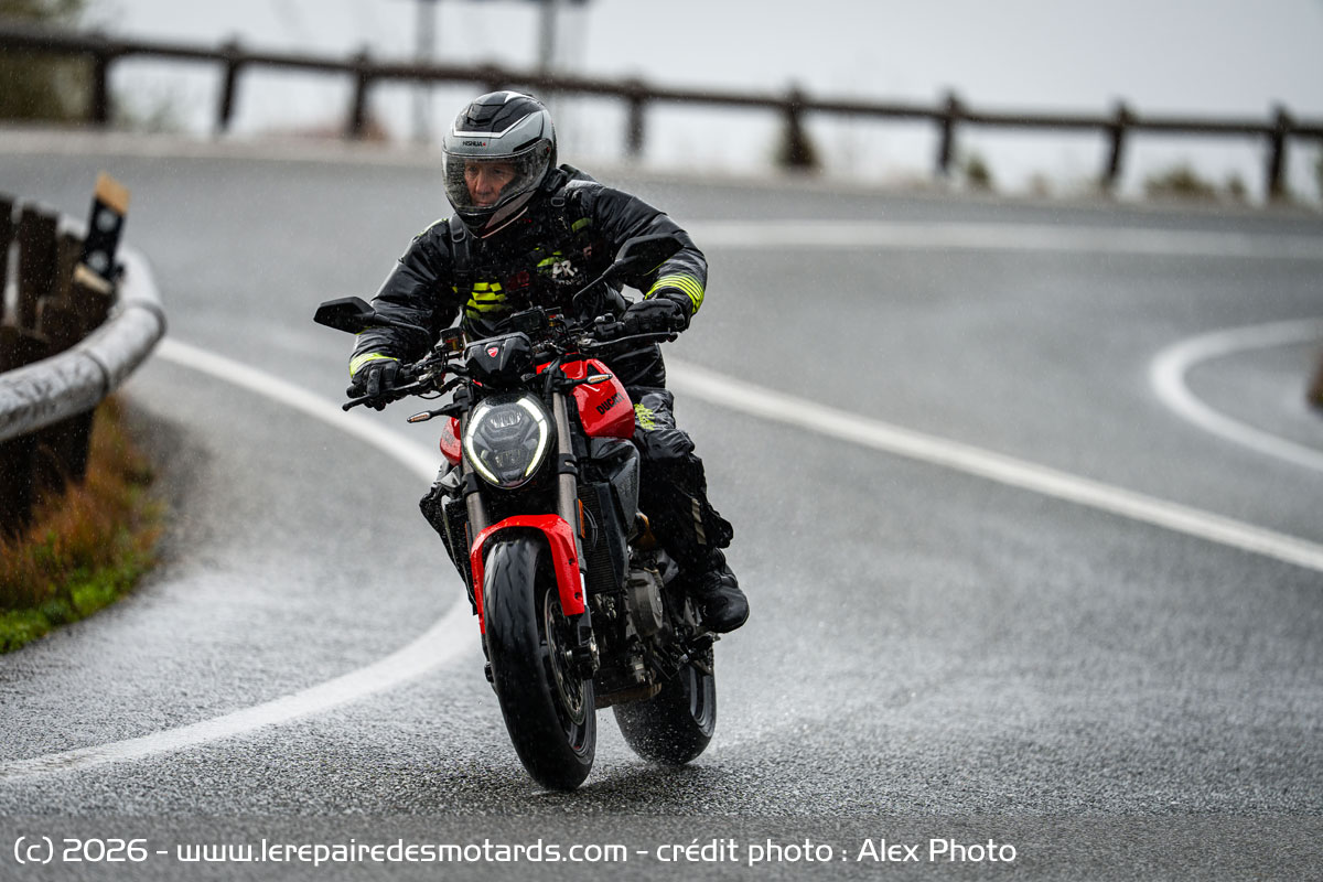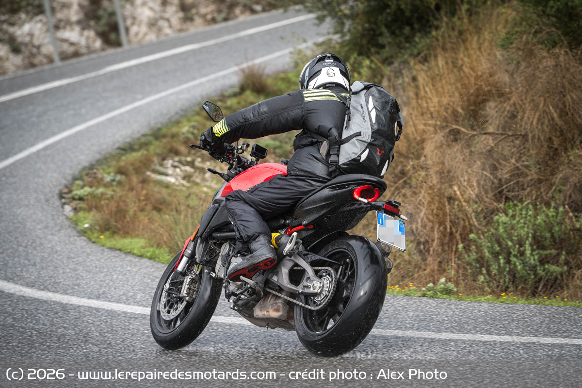 Malgré tout, notre virée sud-sud Bretonne de Malaga nous a permis de vérifier des points d’importance, car croiser la pluie peut arriver à tout possesseur de l’Italienne. En en pareil cas, ce sont surtout les pneus qui agissent tels des talismans auprès des pilotes. Pas de mauvais œil sur les trains roulants du Monster. La gomme Pirelli tient le pavé et évacue efficacement l’eau, assurant un grip correct sur l’asphalte souvent assez rugueux. Pour autant, on n’ira pas provoquer le mauvais sort. Typés sport- route, parcourus d’entaillements réduits, les Diablo Rosso IV restent limités par ces conditions et il n’est pas rare de faire décrocher l’enveloppe arrière à la remise des gaz. C’est alors que l’on évalue un autre équipement bien utile : l’électronique.