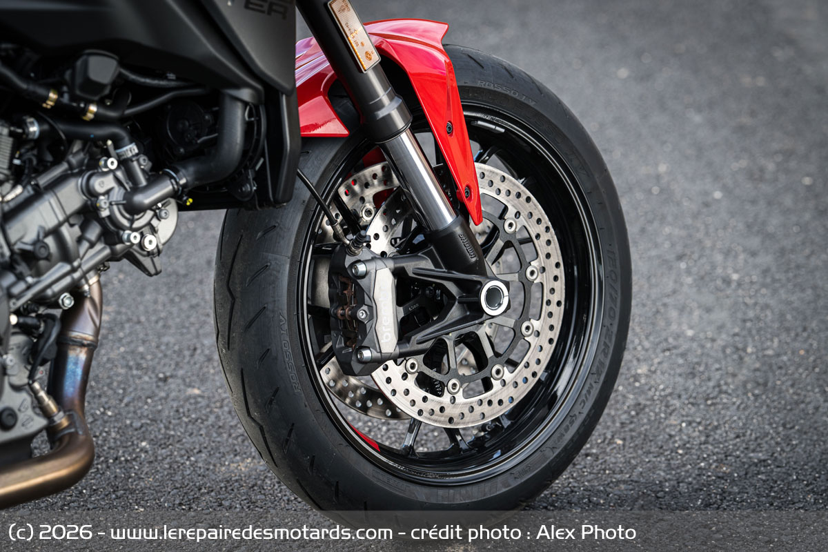 Pour stopper la gracile voyageuse, des étriers monoblocs à montage radial Brembo M4.32 à quatre pistons attaquent deux disques de 320 mm sous la férule d’un maitre-cylindre radial PR18/21. L'élément opposé à double piston serre un plateau de 245 mm. En alliage d’aluminium léger, les jantes à 5 branches dédoublées de 17 pouces chaussent des Pirelli Diablo Rosso IV en120/70 et 180/55.
