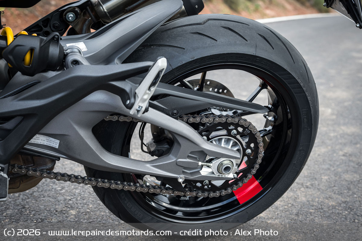 Et très visiblement, le moteur parait bien plus étroit, mais au prix d’une concession majeure… Plus de rappel desmodromique et donc de caches latéraux des courroies. Basculeurs et ressorts animent des soupapes à tige creuse. Dans cette version conçue pour le roadster, le bloc délivre 111 ch à 9 000 tours et un couple de 91,1 Nm à 7 250 tr/min. Bien plus courte, la course privilégie l’explosivité et les montées en régime. Au détriment peut-être d’un peu de caractère… D’autant que la démultiplication finale est de 16 x 42, longue comme un jour sans moto.