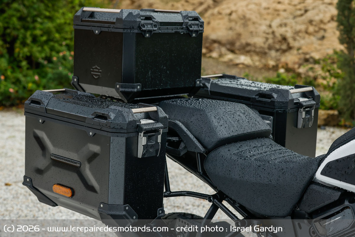 Pour dompter la cavalerie, Harley lui a bien sûr greffé des puces à transistors par paquets. Via un accélérateur Ride by Wire associé à la centrale inertielle (IMU) pour moduler en conséquence frein moteur, freinage combiné (C-ABS) et contrôle de traction en virage (C-TCS), le système ajuste simultanément réactivité moteur et niveau des assistances défini par les 7 profils de pilotage de cette Pan-Am Limited (Route, Sport, Pluie, Off-Road, Off-Road Plus et deux modes perso supplémentaires).