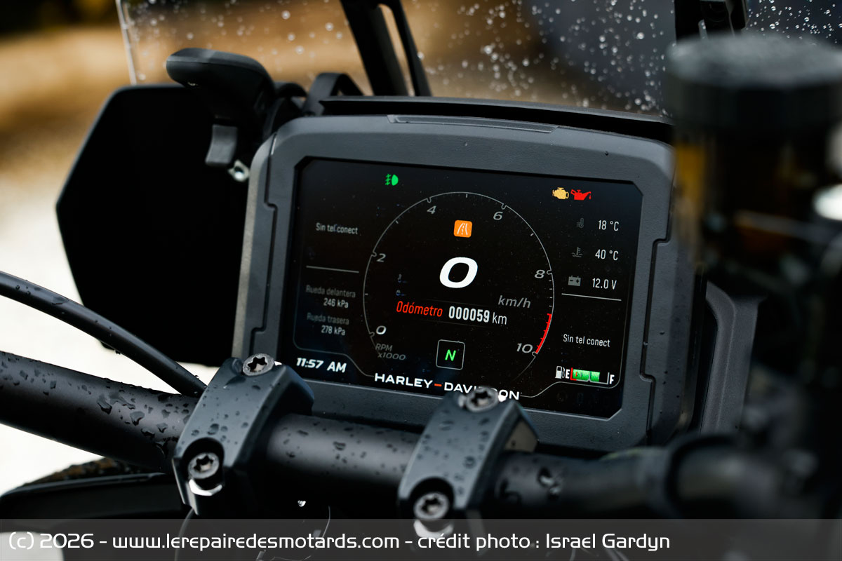Non rétroéclairés, les commodos se bardent de boutons et poussoirs pour commander les fonctionnalités de la machine. L’ergonomie n’est pas parfaite sur ce point, mais l’ensemble reste exploitable. Sous les yeux, un large écran TFT de 6,8 pouces à surface sans reflet, inclinable, à fond blanc ou noir, tactile à l’arrêt, permet donc de piloter le vaste éventail d’informations et assistances de la Pan America. S’y regroupe l’icône du profil de pilotage choisi, tachymètre, compte-tours, indicateur de rapport engagé, compteur kilométrique, jauge de carburant, de température moteur et ambiante, horloge, odomètre, deux partiels, autonomie, voyant de basse température, voyant de béquille déployée, alerte d’inclinaison et régulateur de vitesse. Les réglages de chaque assistance peuvent être personnalisés dans le ou les modes idoines. Via Bluetooth, on connectera son smartphone pour bénéficier d’une navigation efficace (via app Harley-Davidson seulement) ou passer des appels et écouter de la musique.