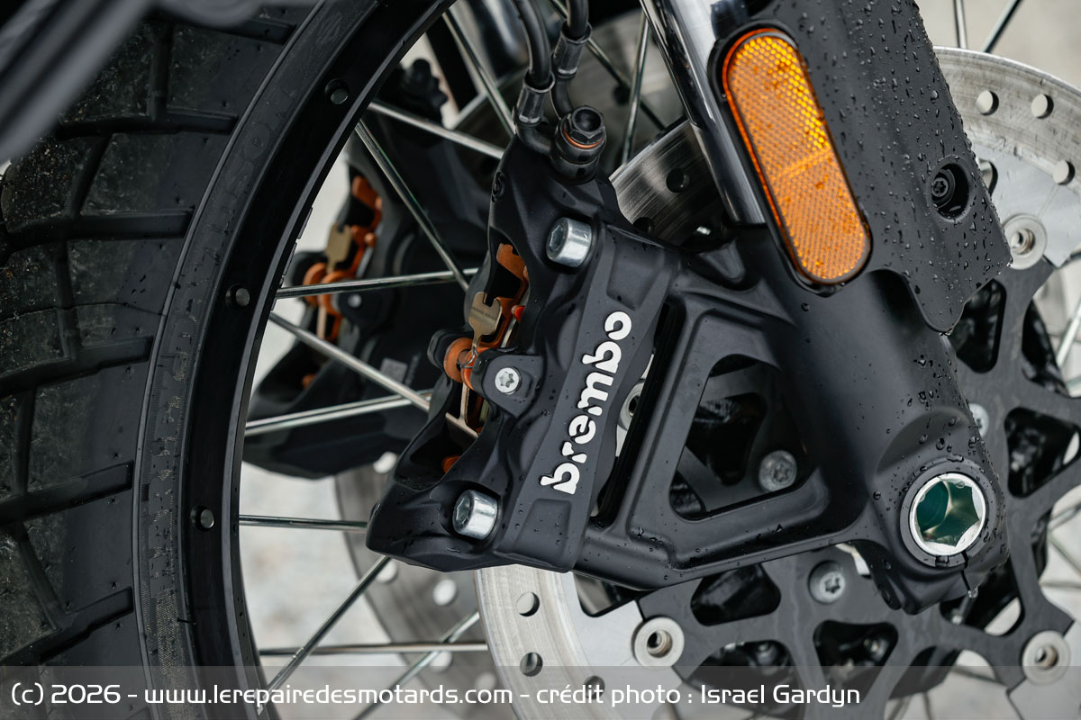 Et pour stopper ces masses, des étriers avant Brembo monobloc à montage et maitre-cylindre radial et 4 pistons viennent mordre des disques de 320 mm. Le ralentisseur arrière, étrier simple piston, pince une frête de 258 mm. Point d’importance, ces éléments sont combinés, assurant ainsi des décélérations optimisées et une meilleure gestion du transfert de masse. De plus, l’ABS sous contrôle inertielle ajoute à la sécurité. L’ensemble garde ainsi finement sous contrôle la rotation des jantes aluminium rayonnées tubeless de 19 et 17 pouces reçoivent des Michelin Scorcher en 120/70 et 170/60.
