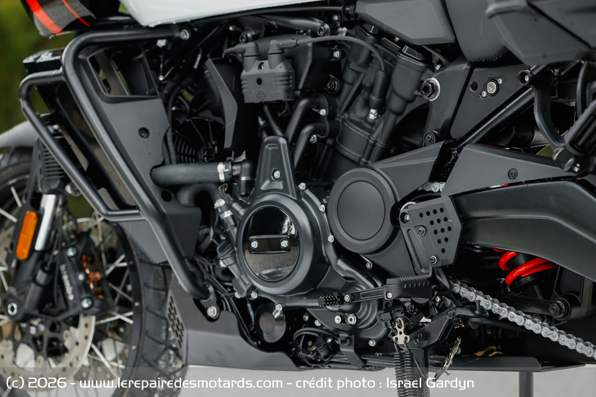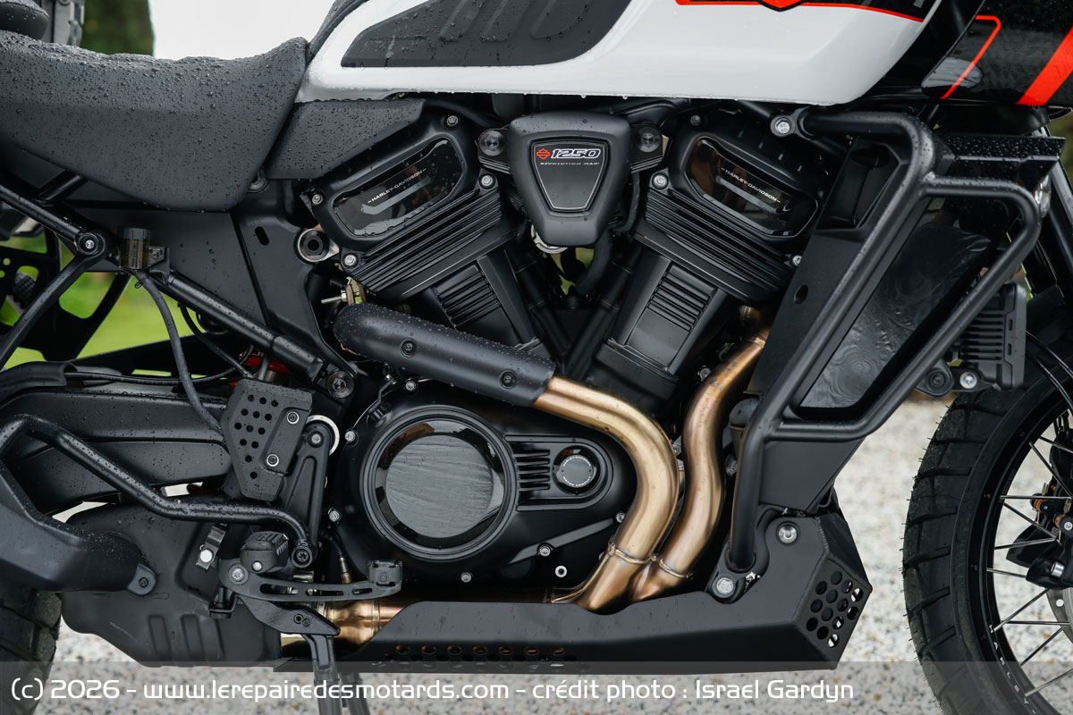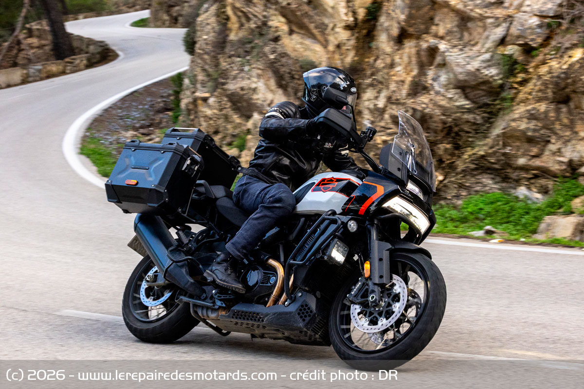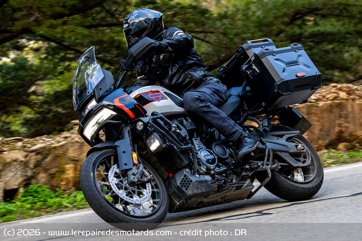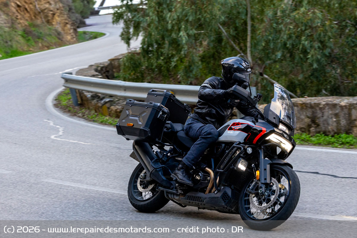 Le V-twin aime à être cravaché et gratifie l’équipage d’un déferlement de couple bien gras au-delà de 6 000 révolutions minute. Le bloc change alors de visage pour se faire presque sportif. Il n’a pas l’exubérance un peu vive de celui d’une KTM 1390 Super Adventure, ni sa rugosité, pas plus que l’explosivité constante du flat d’une BMW R1300 GSA. Plus rond, il dispose d’une élégance de fonctionnement évoquant, un peu, le style de la marque américaine. La prise de hauts régimes rapide et la puissance en plus, ajustée par la distribution variable VVT. Toutefois, les presque 300 kilos limitent forcément les performances.