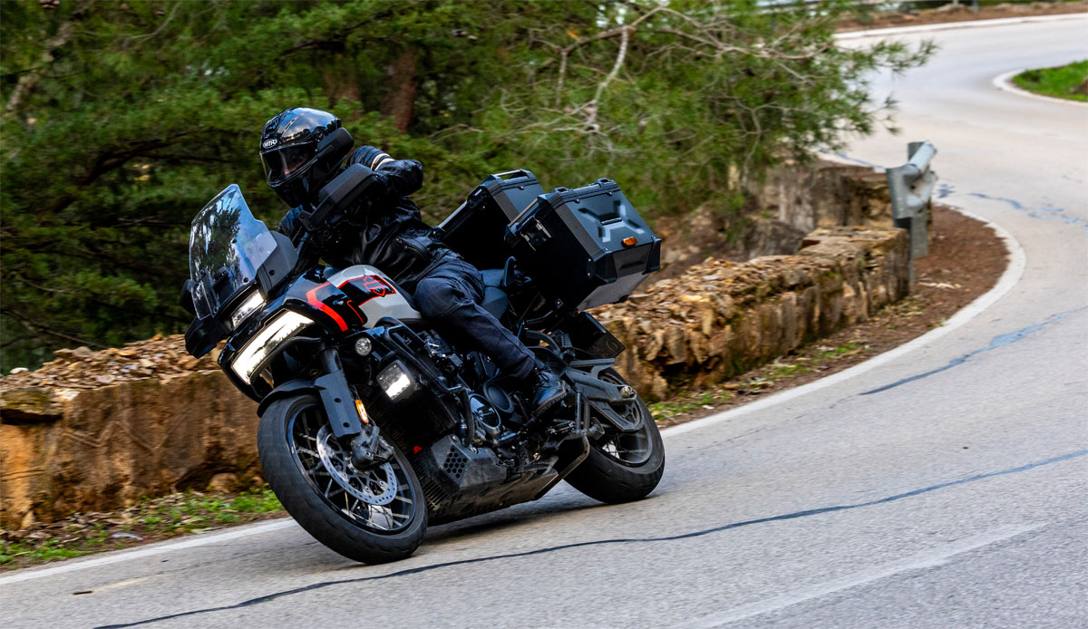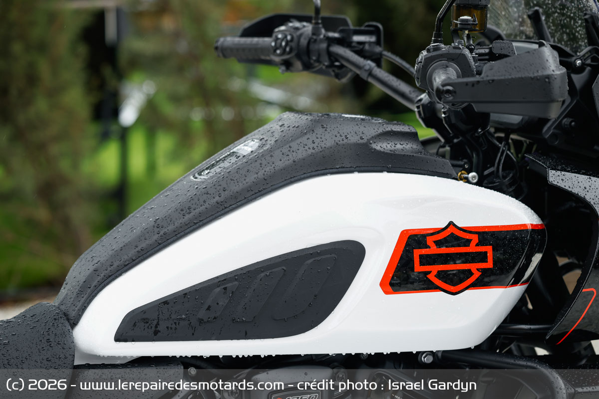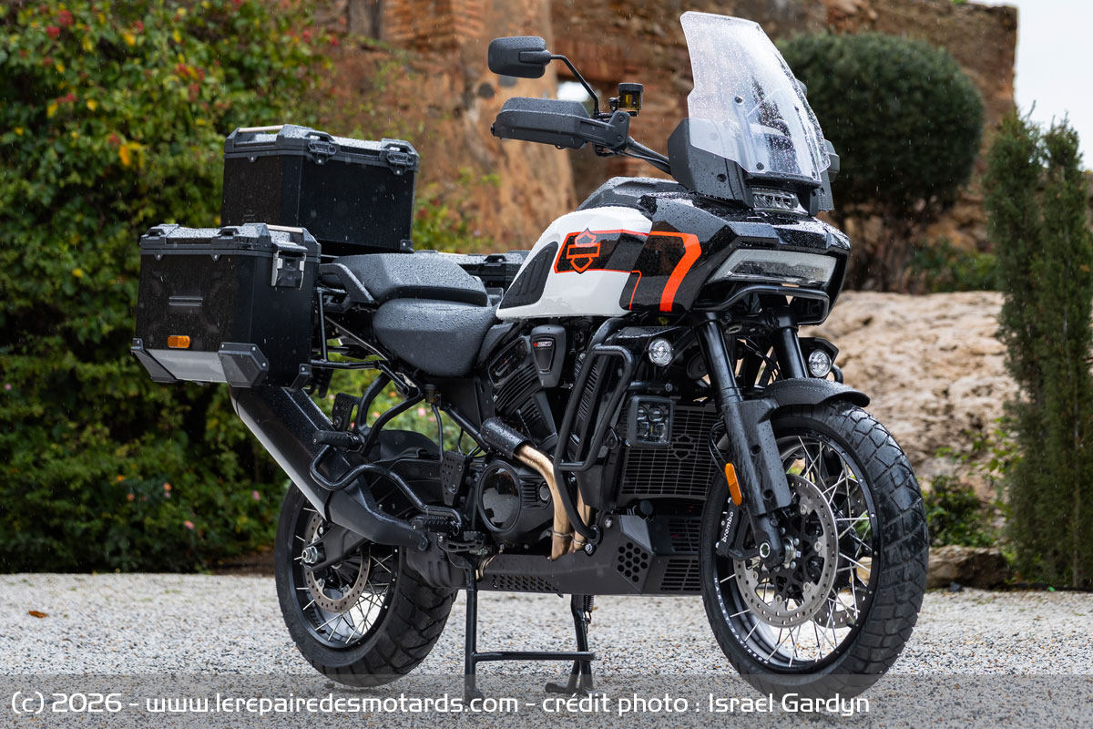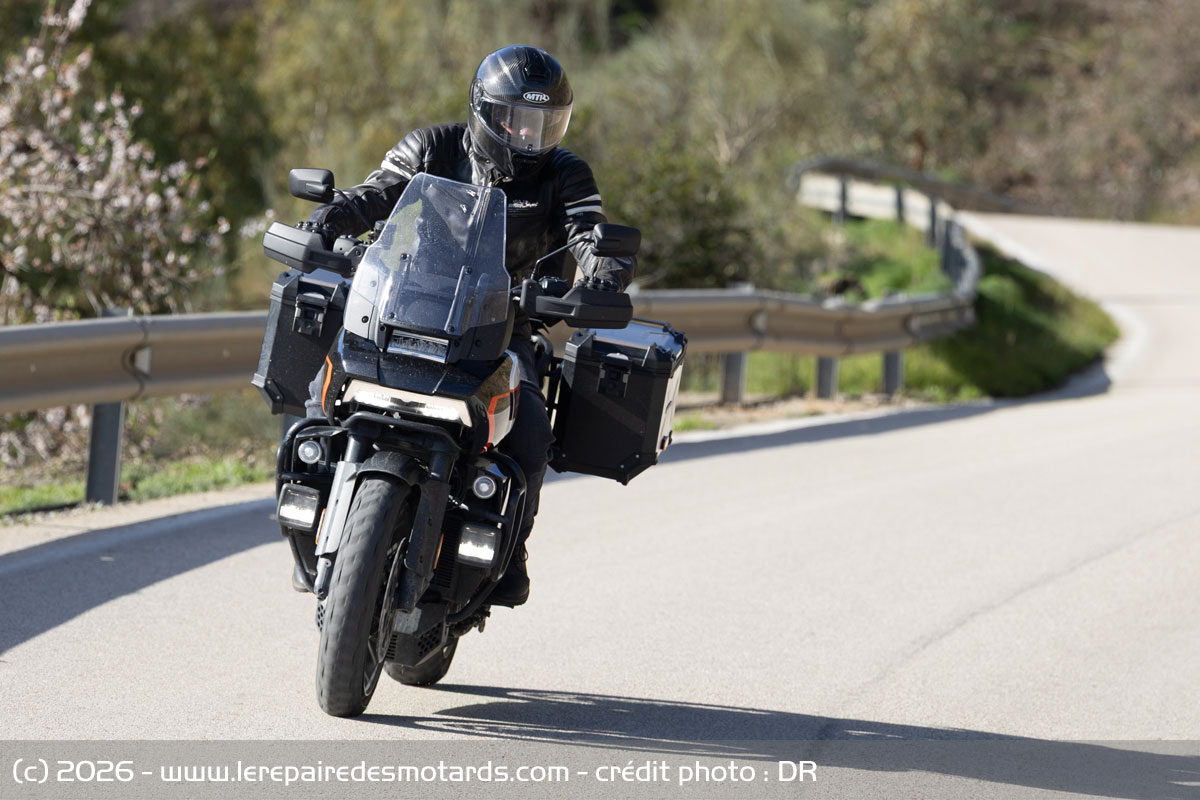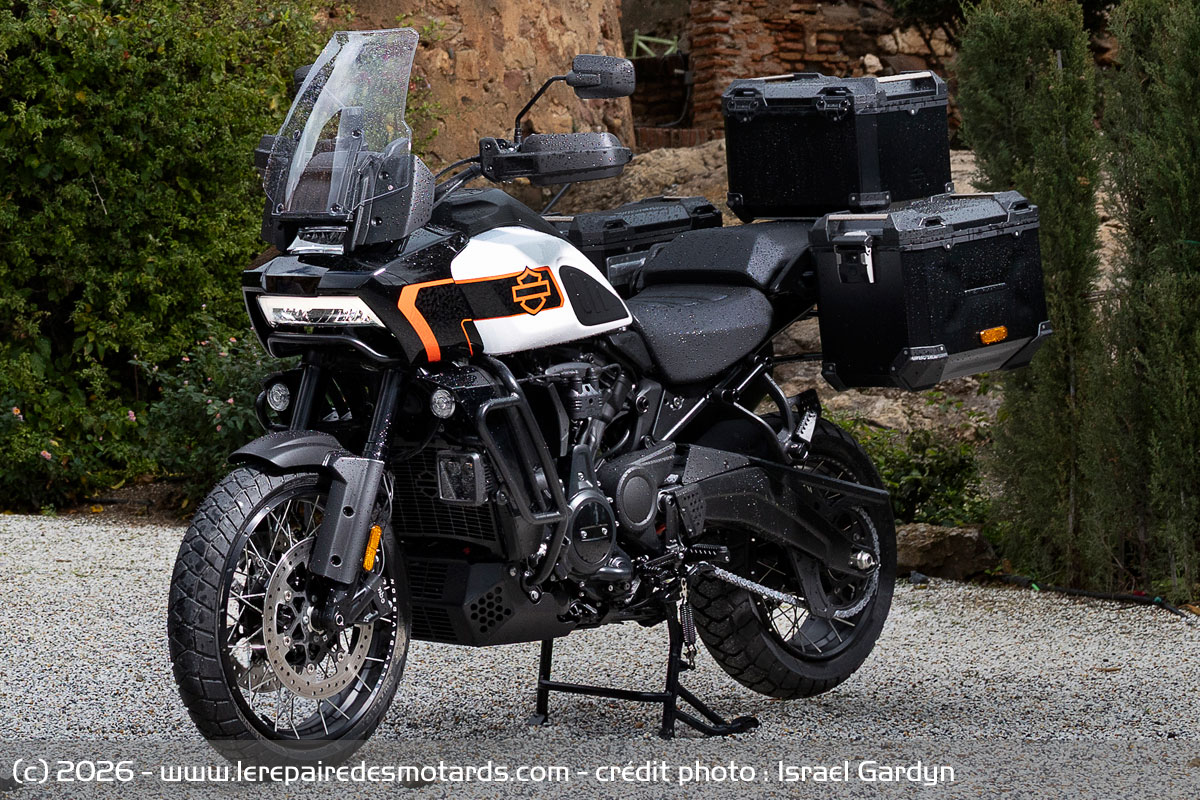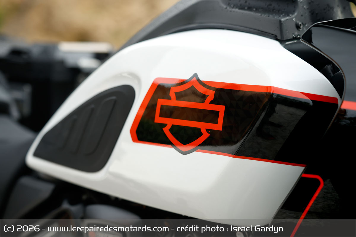 Le V-twin aime à être cravaché et gratifie l’équipage d’un déferlement de couple bien gras au-delà de 6 000 révolutions minute. Le bloc change alors de visage pour se faire presque sportif. Il n’a pas l’exubérance un peu vive de celui d’une KTM 1390 Super Adventure, ni sa rugosité, pas plus que l’explosivité constante du flat d’une BMW R1300 GSA. Plus rond, il dispose d’une élégance de fonctionnement évoquant, un peu, le style de la marque américaine. La prise de hauts régimes rapide et la puissance en plus, ajustée par la distribution variable VVT. Toutefois, les presque 300 kilos limitent forcément les performances.