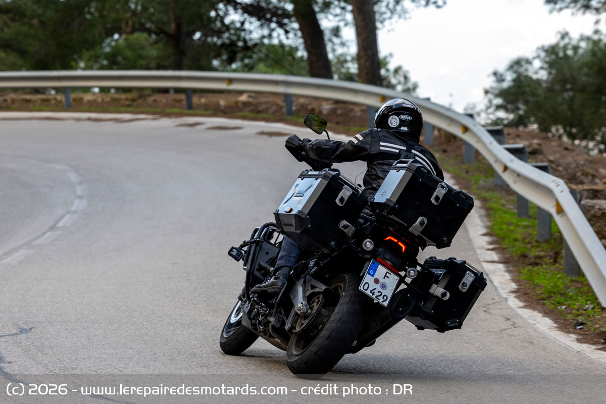 Une légère inertie est sensible sur les changements d’angle rapides et les masses des valises, sur l’arrière, font alors parfois sous-virer la machine qui s’écarte un peu de la trajectoire imprimée. Mais il faut déjà pousser le trail à bonne allure pour le noter vraiment. Le transfert de masses est, lui, plus sensible lors de la prise des freins. Le système combiné assure des décélérations étonnement efficaces pour une machine si imposante. Mais les suspensions électroniques peinent à la gérer pleinement, même en profil Sport. La fourche s’enfonce assez vite sur ces fourreaux et l’amortisseur ne retient pas assez la moto. Mais l’électronique bosse sérieusement et conserve la moto en ligne même sur les plus fortes décélérations. Bref, il faut garder en tête cette donnée si l’on veut hausser le rythme. Ou choisir la Pan America en version Standard, 55 kilos plus légère et ses suspensions mécaniques à mon avis plus efficaces et constantes.