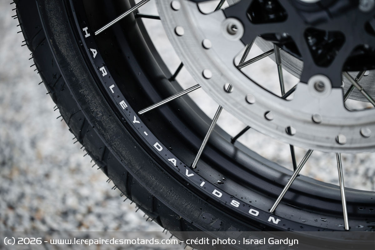 Stable sur l’angle, la Harley garde parfaitement son cap dans les longues courbes. Ses Michelin Scorcher, des Anakee Adventure renommés pour Harley, offrent grip et stabilité sur leurs flancs. Le trail en sort avec dynamisme et la sonorité grondante de sa boite à air de 11 litres. Les rapports s’additionnent alors, mais pas toujours facilement avec ce quickshifter rugueux en montée. Et parfois la vitesse ne passe pas. Bizarre, car notre essai précédent en faisait l’éloge. À l’inverse, le rétrogradage est facile, rapide et précis.