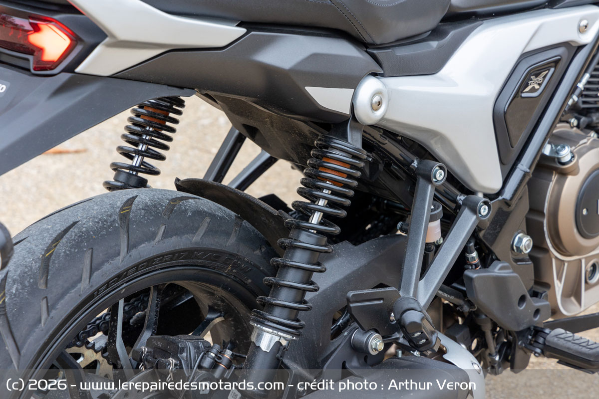 Construit autour d’un cadre tubulaire en acier dont le noir brillant n’est pas toujours très agréable à l’œil, la machine propose une imposante fourche inversée KYB de 43 mm qui débat sur 130 mm. Rien n’est réglable, mais elle offre d’origine une très bonne tenue de route et un confort très acceptable, exception faite des saignées à haute vitesse. On lui pardonne. Si le combiné d’amortisseurs arrière n’est pas siglé, il offre un bon maintient et est réglable facilement en précharge avec la clé à ergots fournie dans la trousse à outils sous la selle. L’ensemble des suspensions est étonnant pour une moto de cette gamme !