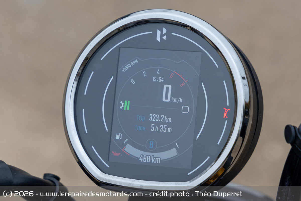 L’écran qui nous accueille est carré, mais intégré dans une instrumentation ronde. Dès qu’on tourne la clé (sans puce antidémarrage), l’interface prolonge les lignes qui sont à l’extérieur. Le tout est un peu « cheap » dans la réalisation, mais on a déjà vu pire. On s’y habitue vite, surtout en mode nuit où l’écran sur fond noir s’intègre mieux au tableau de bord. La navigation est relativement intuitive grâce à quatre boutons au commodo gauche. La moto dispose du Bluetooth, ce qui permet de contrôler la musique et autres joyeusetés, mais on préfèrera utiliser un intercom ou un support de téléphone au guidon.