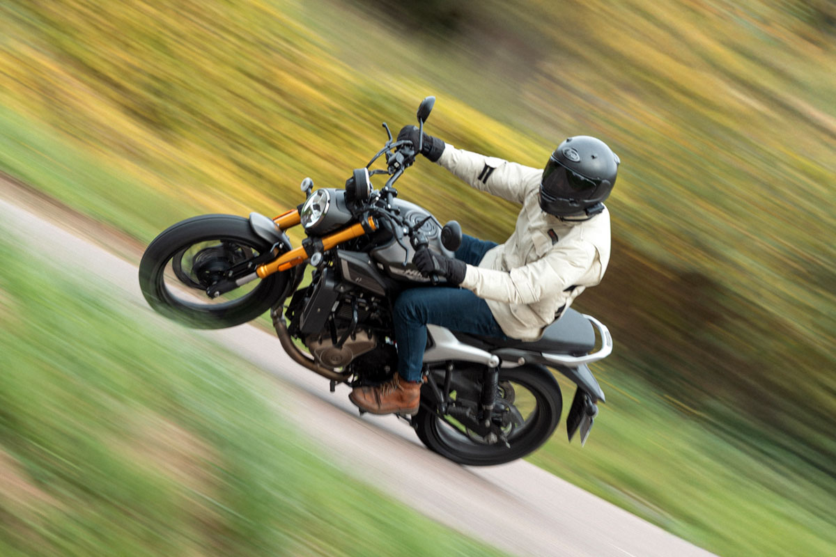 C’est une moto très facile à vivre, particulièrement en ville. L’embrayage très progressif aide tous les départs et le moteur est parfaitement dosable avec la poignée à câbles. Il faut mettre du gaz, mais le couple est bien présent, ce qui est étonnant pour cette cylindrée. Malgré une selle à 803 mm et un poids annoncé à plein frisant les 190 kg, la machine se révèle très agile. Particulièrement appréciable à basse vitesse où on manœuvre facilement et on se faufile entre les voitures sans gêne, le rayon de braquage étant bon pour la catégorie et le poids plutôt en bas.