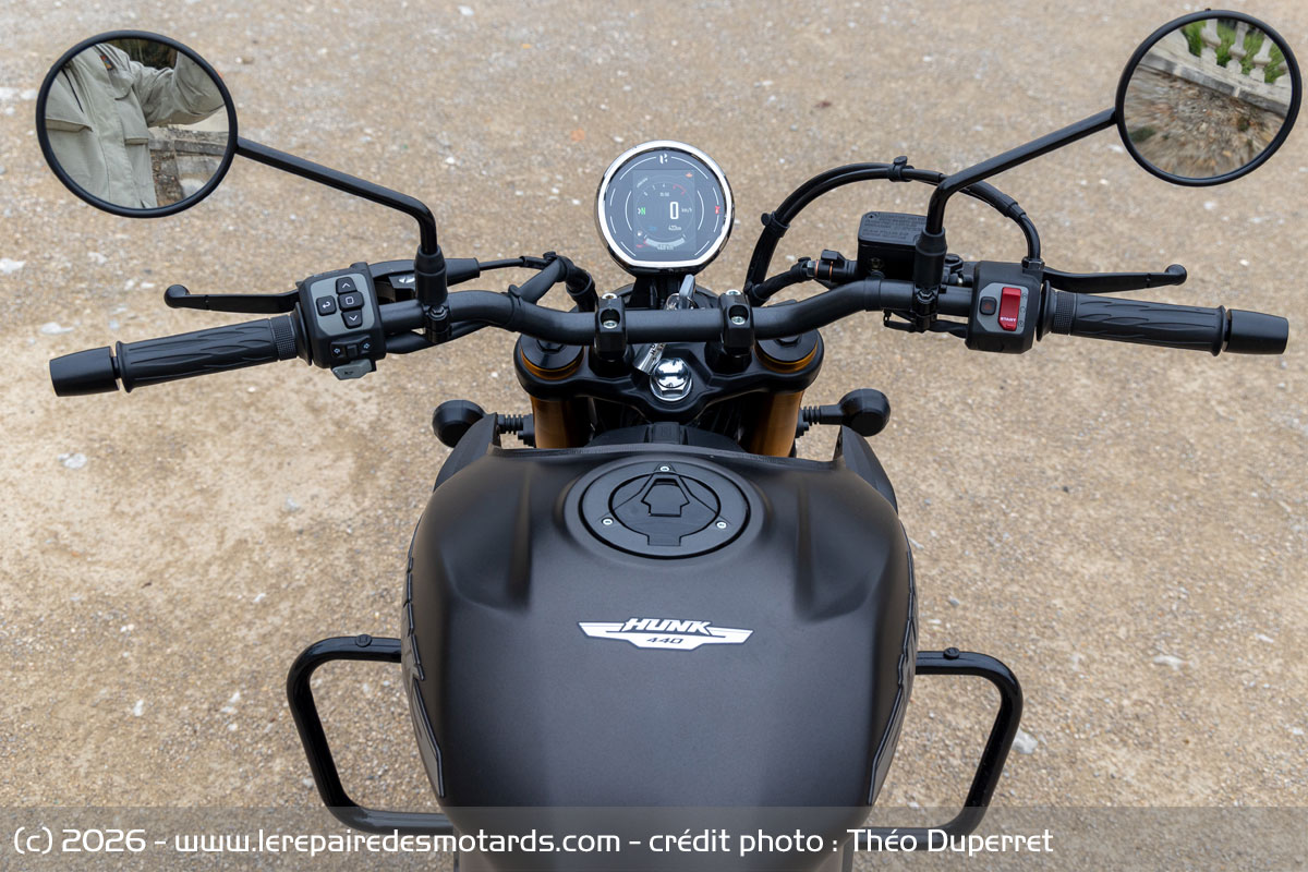Pour convenir aux différentes morphologies, une option de leviers réglables aurait été bienvenue. Ceci étant, on doit pouvoir trouver des leviers réglables pour Harley X440 qui seront certainement compatibles avec la Hunk 440, vu que le système de freinage est d’apparence identique.