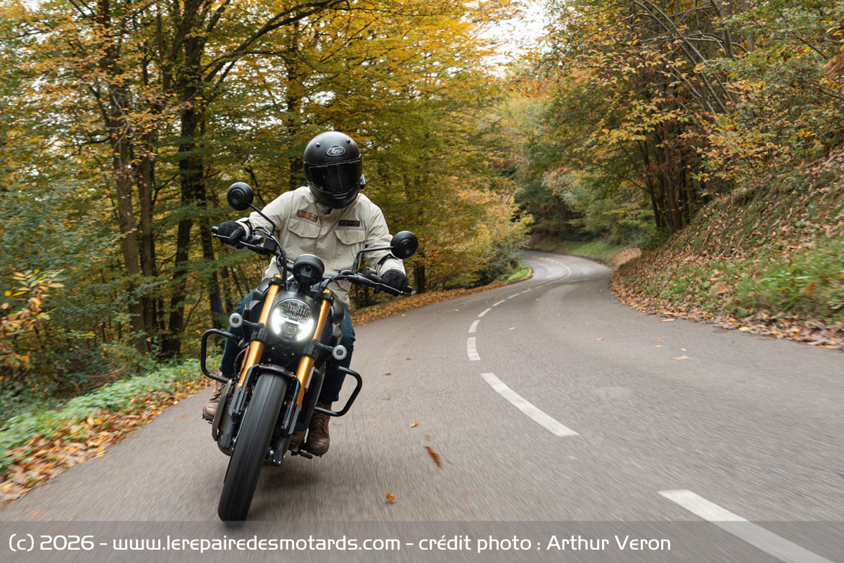 Si le confort est très acceptable pour la catégorie avec une selle plutôt plate, l’absence de top-case et de Sissy-bar rend difficile l’option trajets longs en duo. Certains passagers ont remarqué que des vibrations remontaient, ce qui peut être désagréable sur les longs trajets. Sur les grosses saignées, on reste un peu secoué. La forme de la selle ne permet pas une grande mobilité, donc on se sent vite coincé, notamment lors de portions rapides prolongées où les vibrations remontent par l’assise. C’est donc un point qu’on pourra faire refaire par un sellier à l’occasion.