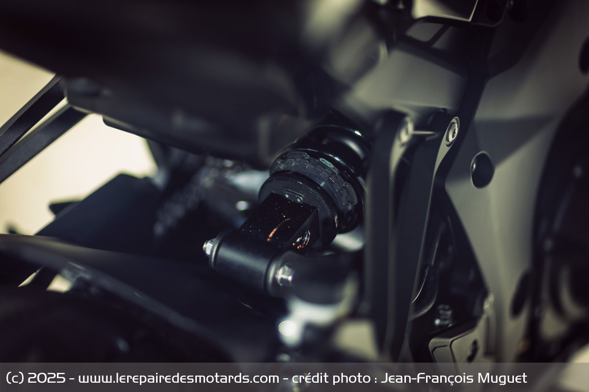 De fait et c’est un comble, plus on hausse le rythme et mieux l’on se sent au guidon de la nouveauté 2026. Reste à voir ce que l’on est prêt à tolérer comme écart comportemental et surtout à se méfier des routes en mauvais état, enclines à secouer plus fort que voulu et à faire sortir de la trajectoire imprimée. L’avant demeure remuant et prompt à bouger en latéral (tiens, pas d’amortisseur de direction…) et en horizontal, lorsque l’on commence à l’alléger à coup de chevaux bien nerveux.