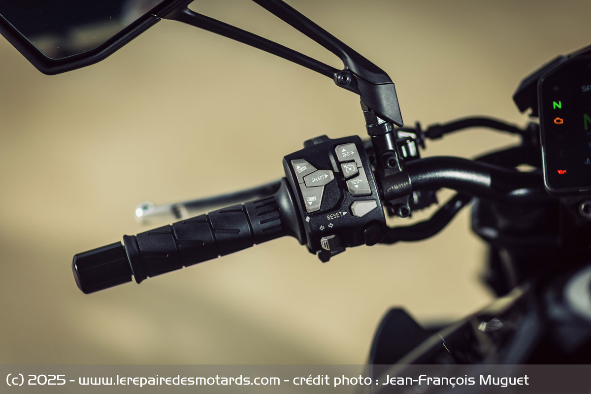 5. Les commodos et des commandes à la main, déjà vus sur les 1100. Le ride by wire et les assistances électroniques font leur apparition sur ce modèle 2026. La poignée droite le démontre, il n’y a plus de câble d’accélérateur, mais un câble électrique, plus discret et moins encombrant. Ceci a permis l’adoption d’une gestion des Modes, à droite, régissant le comportement : Rain, Road Sport et User, celui que l’on peut configurer au niveau de la puissance et du contrôle de traction de manière rapide. Côté gauche, le régulateur de vitesse fait également son apparition, tandis que l’on retrouve un contrôle de traction fraîchement arrivé. Une centrale inertielle fait également partie du package. Son rôle n’est autre que de peaufiner l’action des assistances.