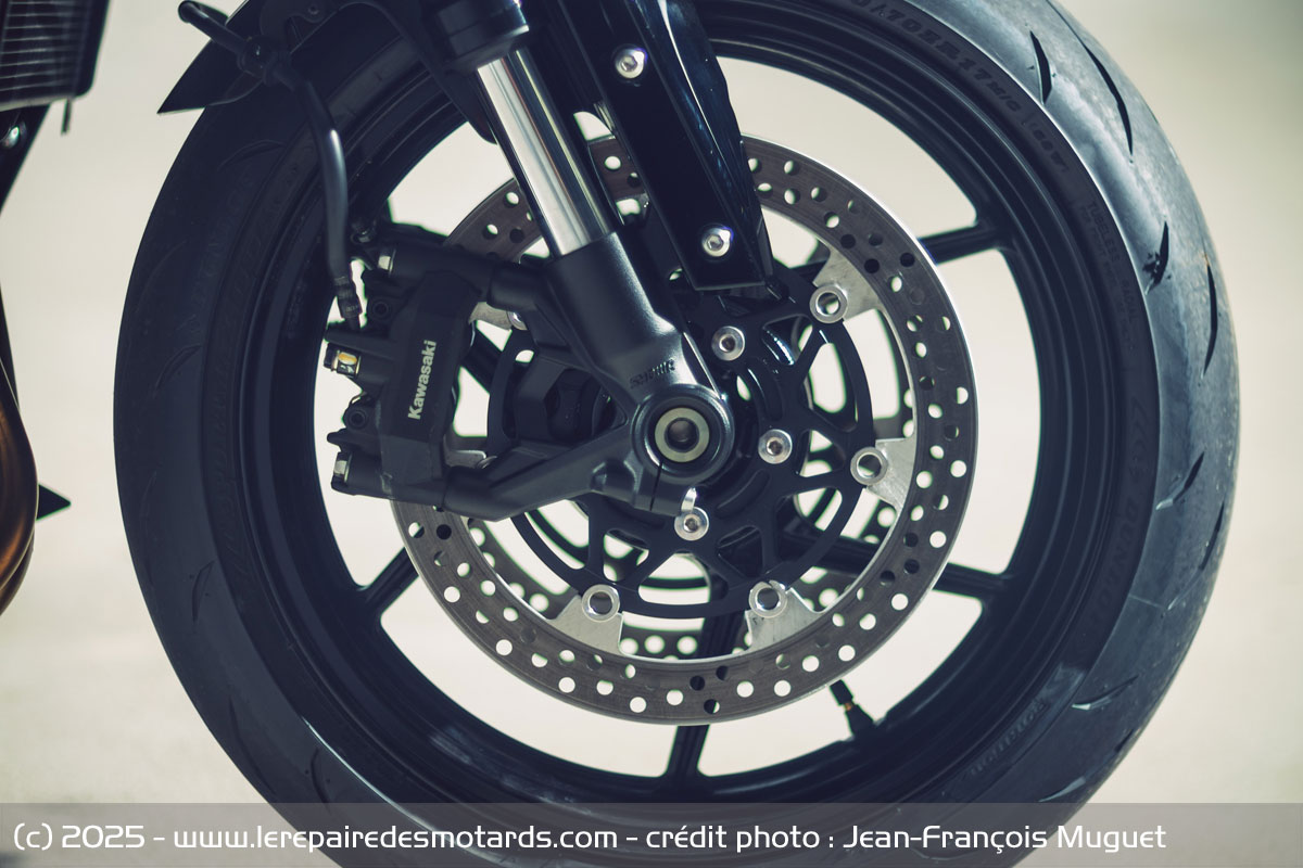 Autre différence entre les deux modèles : le freinage. Les M 4.32 sont plus probants et plus agréables en matière de feeling que les étriers radiaux « Kawasaki ». Ceci posé, l’ABS intervient également différemment en fonction du matériel monté, retardant son intervention avec le modèle Brembo, plus « précis ». Reste un maître-cylindre radial Nissin identique sur les deux modèles dont on devine qu’il offre la même prise en main. Réglable en écartement, on peut jouer sur la sensation d’attaque plus ou moins proche de la garde et jouer sur la puissance appliquée autant que le rendre plus accessible aux doigts les plus courts, dont une paire seulement suffira à appliquer la pression souhaitée.