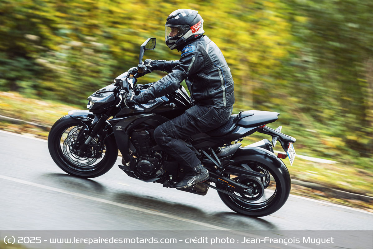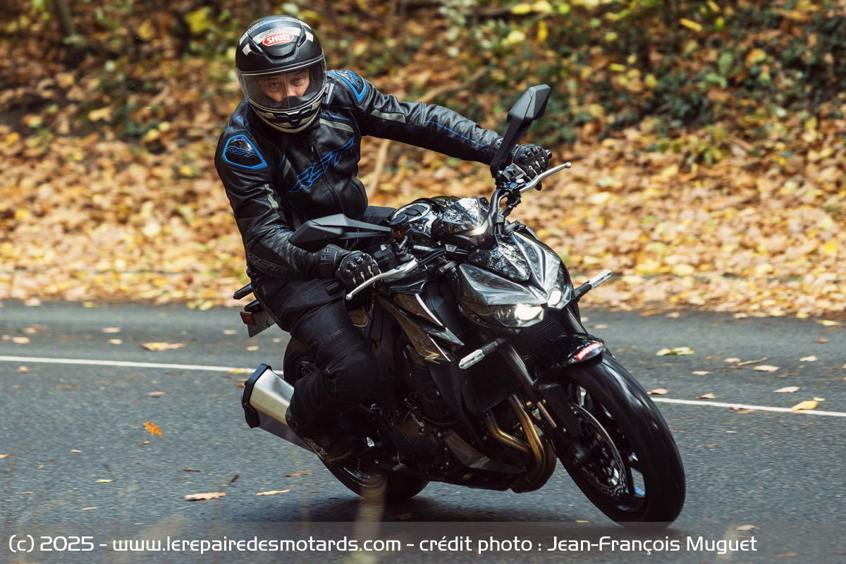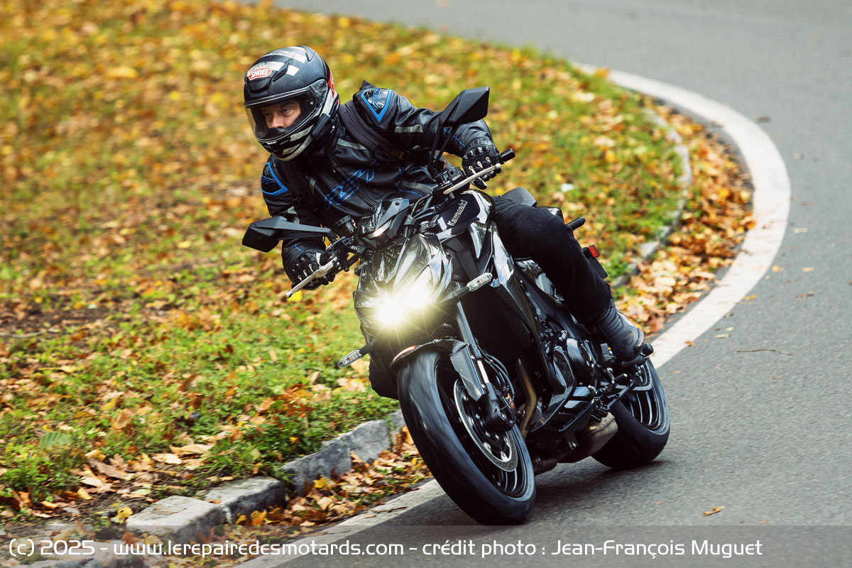 Une semaine en région parisienne dont un premier essai au cours de la tempête Benjamin (octobre 2025) sous la pluie et sur routes mouillées, suivi d’environ 300 km de routes variées, dont certaines « à chèvres » mettant à mal les suspensions de la Z. Le tout par une météo fraîche sous un ciel clément. Moto quasiment neuve.