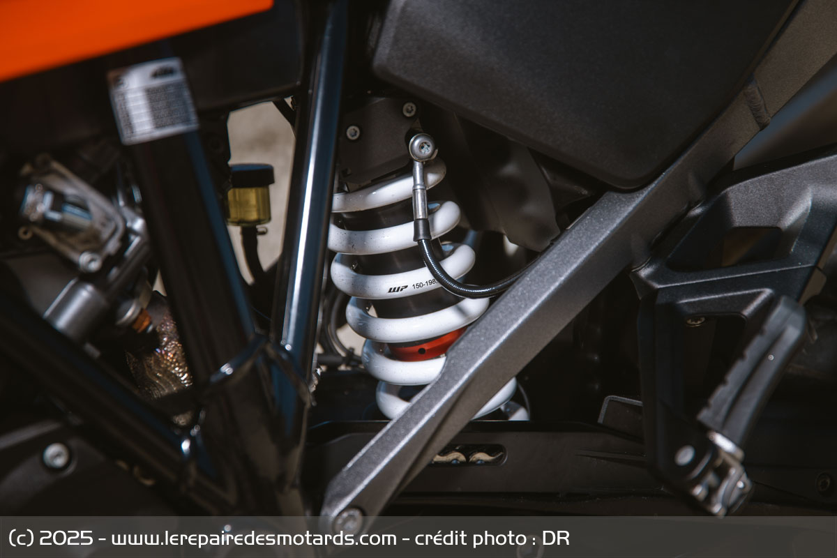 Le kit de suspensions PRO en option permet de bénéficier d’un réglage automatique de la précharge de l’amortisseur ou de paramètres personnalisables pour l’amortisseur ou la fourche ainsi que d’un ajustement Offroad. Également, une fonction anti-plongée limitera fortement les transferts de masses sur les plus grosses décélérations. Notez qu’un vérin de direction équipe la fourche en dotation standard.