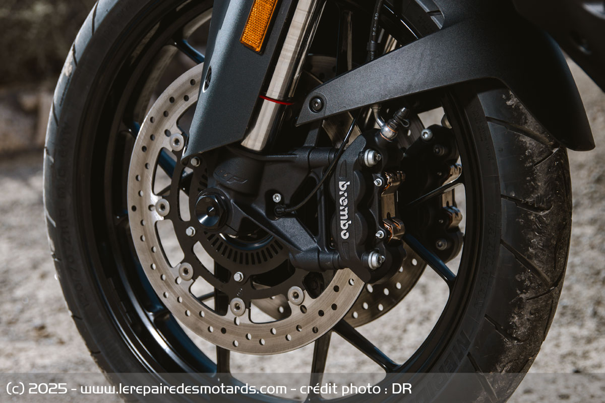 Notre pur-sang bodybuildé a bien besoin d’étriers Brembo à 4 pistons et fixation radiale pour ses disques de 320 mm. Le ralentisseur opposé combine un disque de 267 mm de diamètre et un étrier deux pistons. Et en cas d’urgence l’ABS 10.3 ME et fonction MSC (modulation en virage) et ABS off-road (avant seul et plus permissif).