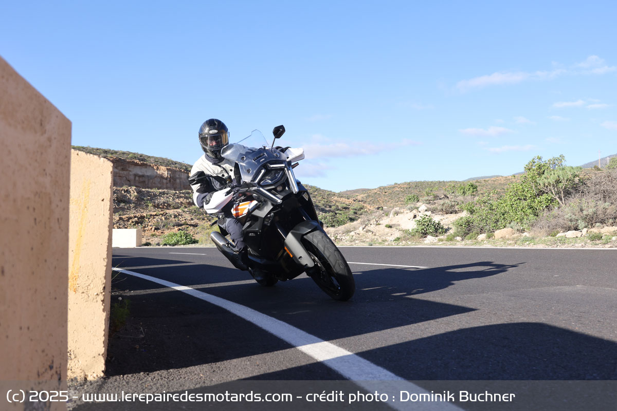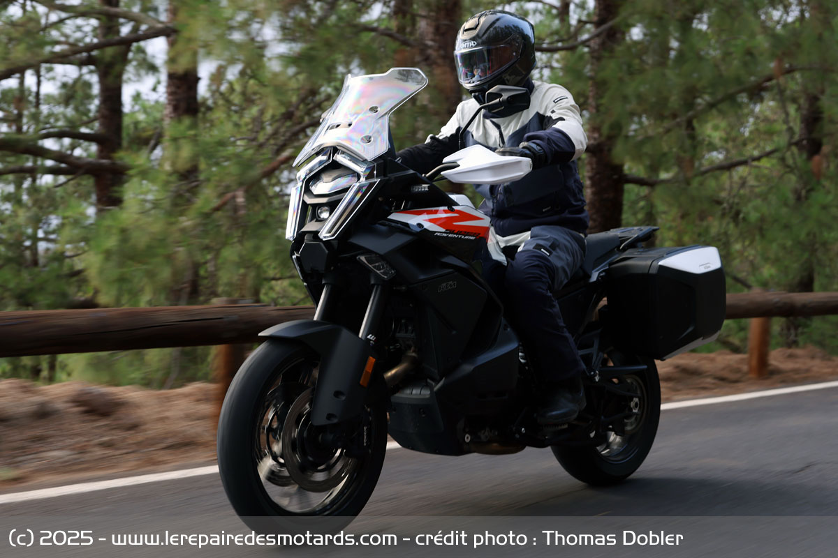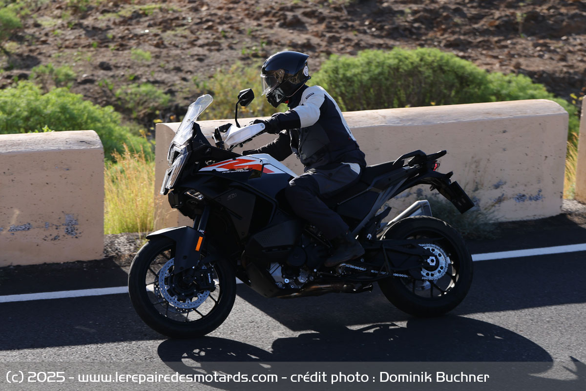 C’est sur le réseau secondaire que la 1390 Super Adventure S Evo aime à se dévoiler. Mais avec deux possibilités, soit en mode automatique soit en Manuel, soit un combiné des deux usages. On peut en effet prendre la main à chaque instant. Personnellement, je ne goûte guère les boites assistées qui ne conviennent jamais pleinement à mon pilotage, surtout en usage dynamique. Si l’AMT est efficace, elle tient trop les rapports en roulage un peu appuyés, tant en mode Sport qu’en Street . Maintenue inutilement trop haut, la mécanique se fait alors moins agréable. De même, les palettes au guidon m’ennuient, ajoutant une fonction supplémentaire à la main gauche, déjà bien occupée. Niveau schéma corporel, cela m’est pénible et inutile. Le pied gauche n’ayant rien d’autre à faire, pourquoi ne pas lui conserver ce seul usage ? Quant au passage des vitesses à la poignée, ils sont, pour moi encore, trop soumis aux aléas des mouvements de poignet du pilote. J’en reviens donc, après moult essais, aux bases efficaces : boite en mode manuelle et sélection à la botte. Ce qui fonctionne parfaitement. Seul l’ergot du sélecteur parait un peu court. On peut alors passer aux choses sérieuses, ce que permet avec brio la montée vers le Teide, volcan de Ténérife.