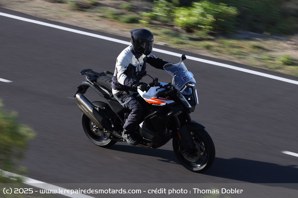 Mais l’on ressent toujours, plus qu’avec toute autre architecture, les coups de pistons en montée de régime qui font pleinement vivre le twin. Piloté au millimètre par la poignée des gaz, il dynamise une partie cycle toujours aussi efficace. C’est notamment le train avant dont la précision et la sensibilité font remonter les informations au pilote qui permettent à ce maxi trail des évolutions sportives. La monte en 170 du pneu arrière lui permet également de valser à l’envie sur cet itinéraire étriqué. La 1390 ne demande aucun effort pur basculer d’un angle à l’autre et semble se diriger au regard. On peut ainsi rouler vite et longtemps sans fatigue sur le réseau secondaire.