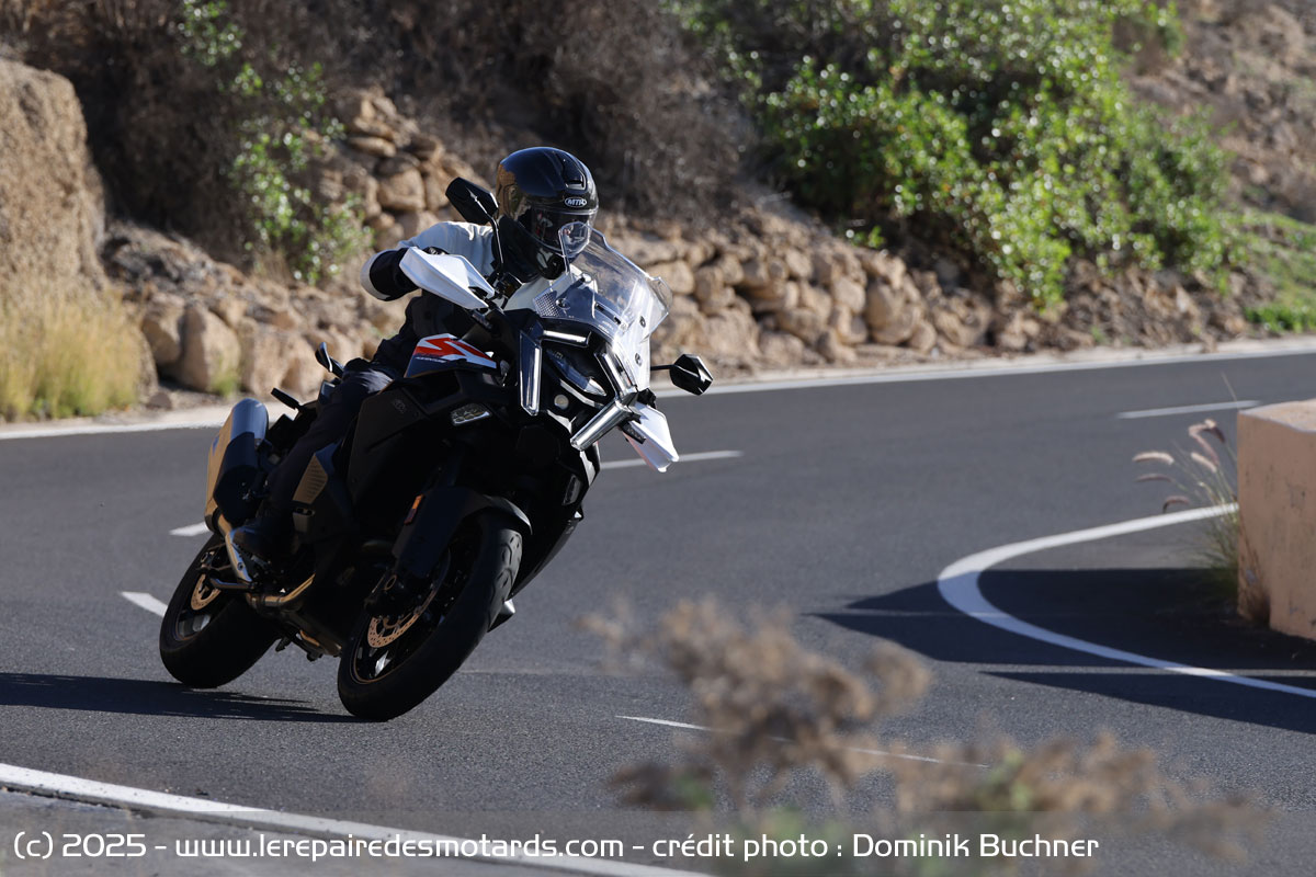 À la nouveauté s’opposera la Ducati Multistrada V4, à partir de 21 590 € pour une puissance identique, sans transmission automatique. Autre Italienne, la Moto Guzzi Stelvio est plus sage avec ses 115 ch et 17 299 €. La reine du segment BMW R1300 GS s’affiche à partir de 22 170 €, mais vous coûtera plus surement 26 825 avec une boite auto perfectible, mais un agrément moteur remarquable. Le trois cylindres de la Triumph Tiger 1200 GT Explorer exige 22 995 € pour une machine au caractère un peu plus flegmatique. Enfin, la plus disruptive, même au sein de sa marque, est bien sûr la Harley-Davidson Pan America 1250 ST. Son esthétique aussi forte que son twin puissant demande 19 990 €.