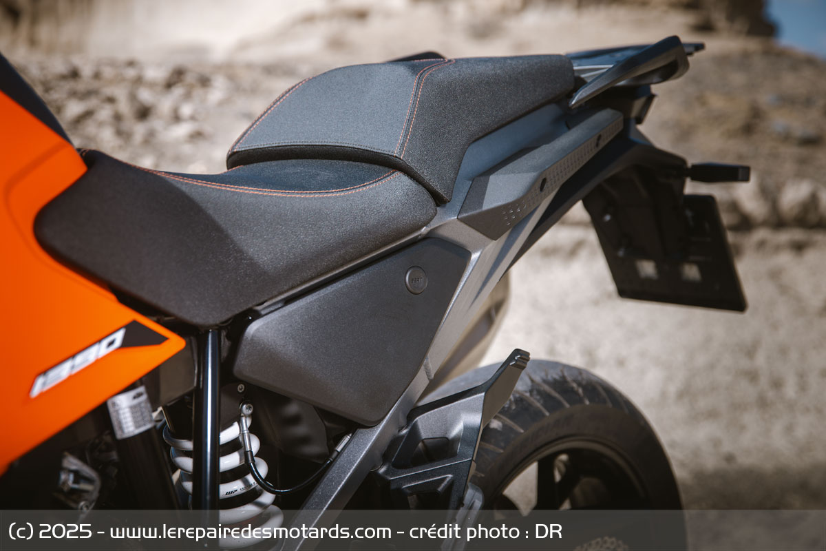 Au-dessus du bouchon de réservoir commandé par transpondeur le vide-poche est désormais plus grand, offrant ainsi plus d'espace pour les smartphones de grande taille. Un connecteur USB-C y est situé sur son côté gauche, un second se trouve sous le tableau de bord pour recharger des appareils supplémentaires. Une nouvelle trousse à outils embarquée, plus complète, est également incluse et rangée dans un coffret compact intégré à l'embase de la selle pilote. 11 variantes d’assises sont disponibles dans le catalogue KTM PowerParts.
