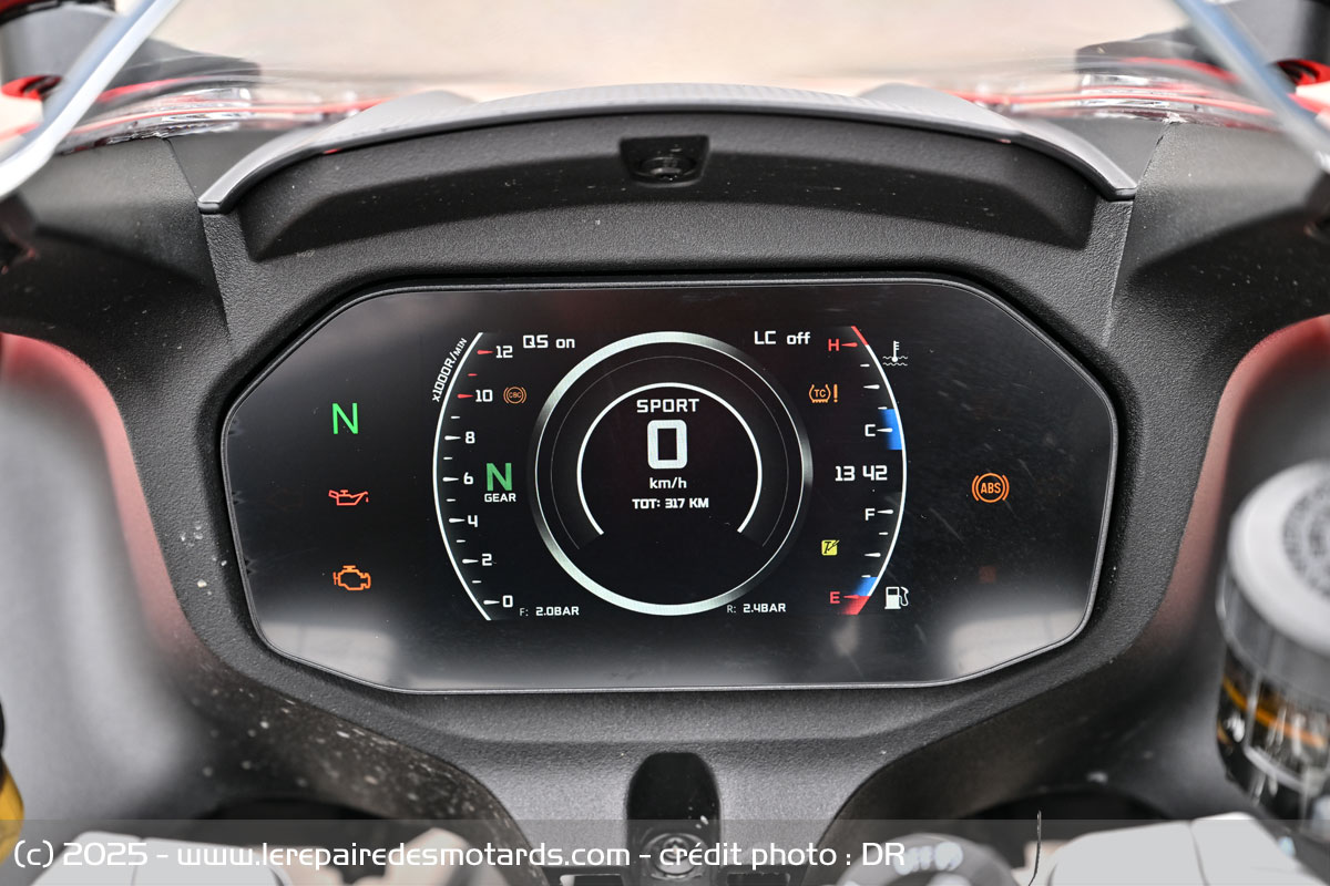 Autant dire que l’on trace son sillon en profitant peut-être de quelques appuis aérodynamiques supplémentaires, mais qu’une longue route droite sera des plus pénibles, y compris du fait de la position de conduite, plus relaxante sur les sportives modernes ou de moindre cylindrée. Pourtant, on retrouve un régulateur de vitesse à la fois simple et pertinent, sous entendant que l’on peut rouler décontracté sur les axes routiers les plus rectilignes. Soit.
