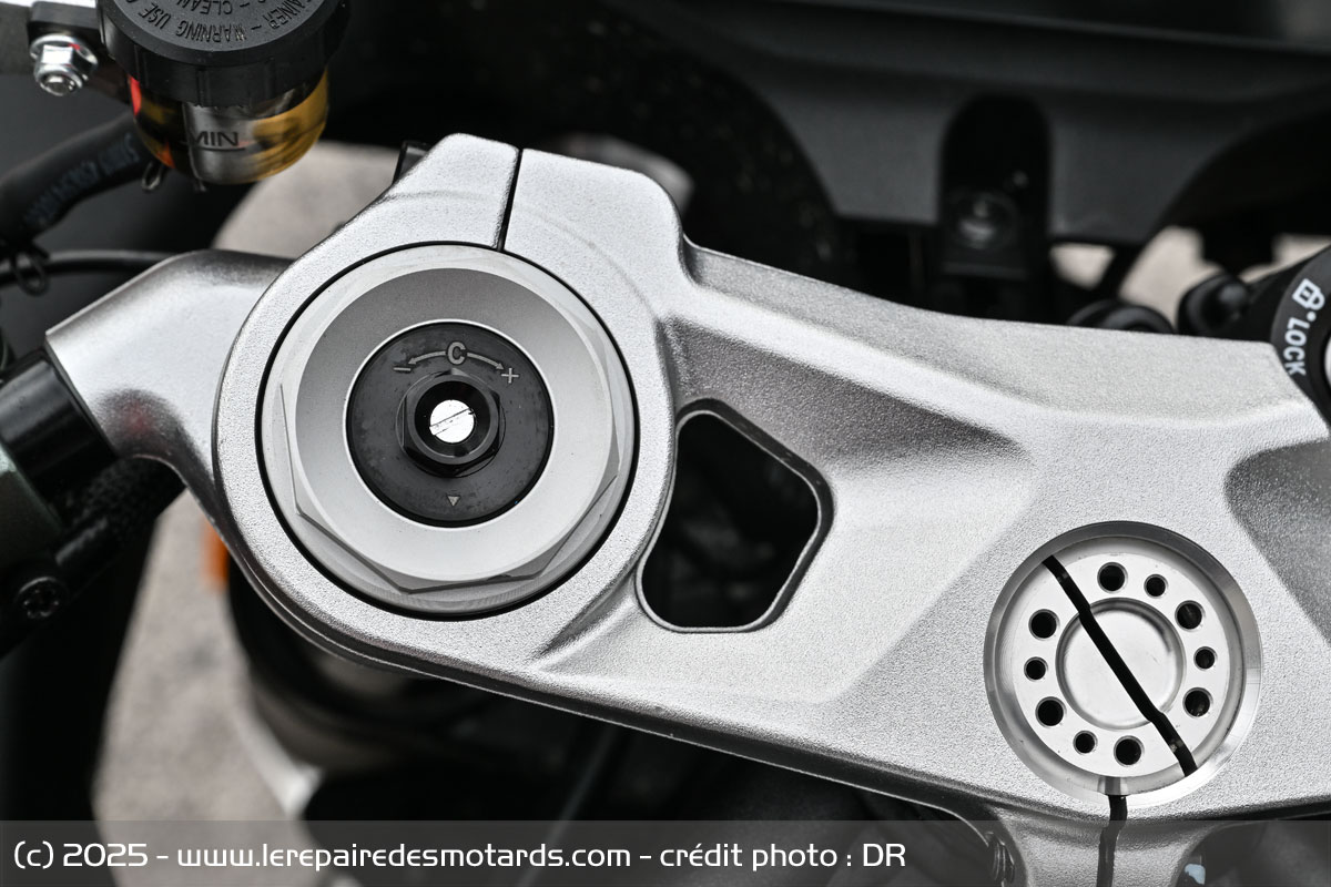 Le mono amortisseur arrière, à bonbonne séparée, profite quant à lui de réglages en tous sens dont une rareté une fois encore sur un amortisseur de série : la possibilité de dissocier la compression à haute et à basse vitesse. 10 niveaux pour le premier paramètre, 12 pour le second. La précontrainte fait également partie de la panoplie, sans oublier un jeu sur l’assiette, non documenté pour ce qui est de l’amplitude des réglages.