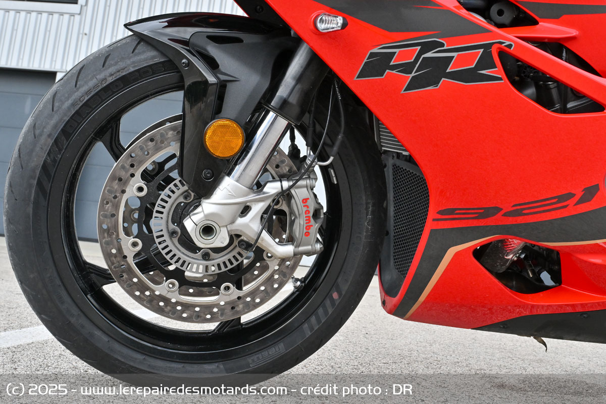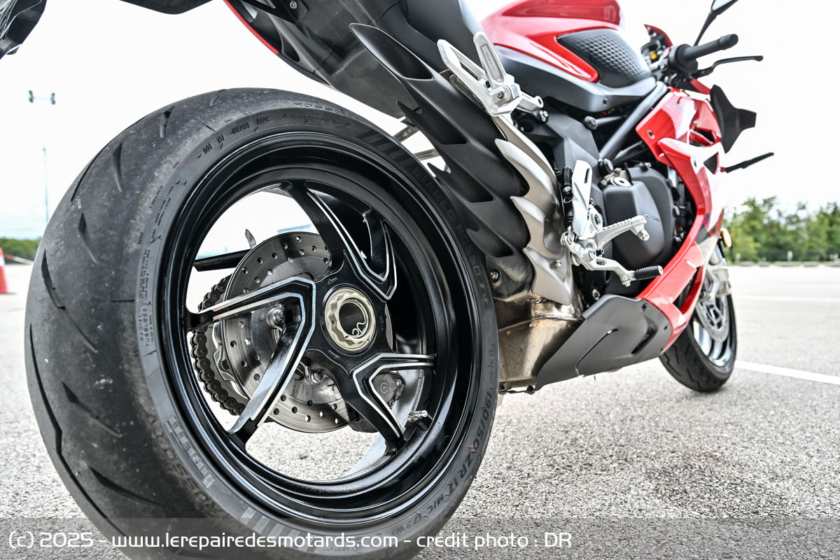 Souvent critiquable sur les Chinoises, le freinage laisse ici peu de place à l’approximation ou à la médiocrité. Brembo est à l’origine du matériel, c’est un fait, mais une marque ne fait pas tout. Une référence non plus, en l’occurrence, des étriers Stylema à fixation radiale bien entendu. Force est de reconnaître la grande qualité du feeling, de l’attaque et la précision impressionnante apportée sur le sec comme sur le mouillé par l’ensemble pinçant des disques de 320 mm de diamètre. Certes le levier demeure ferme, quel que soit son réglage, mais le toucher de la commande est un régal.