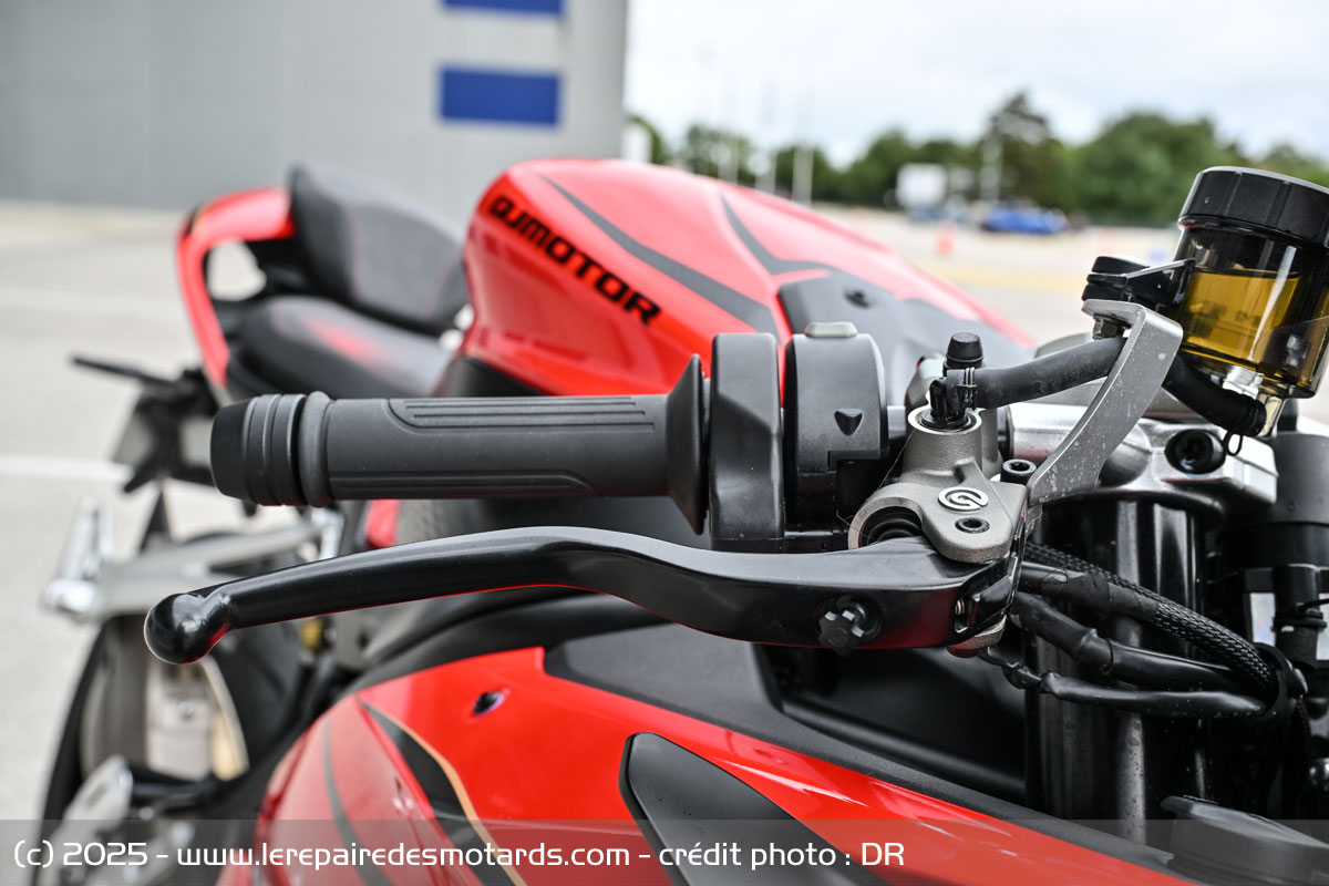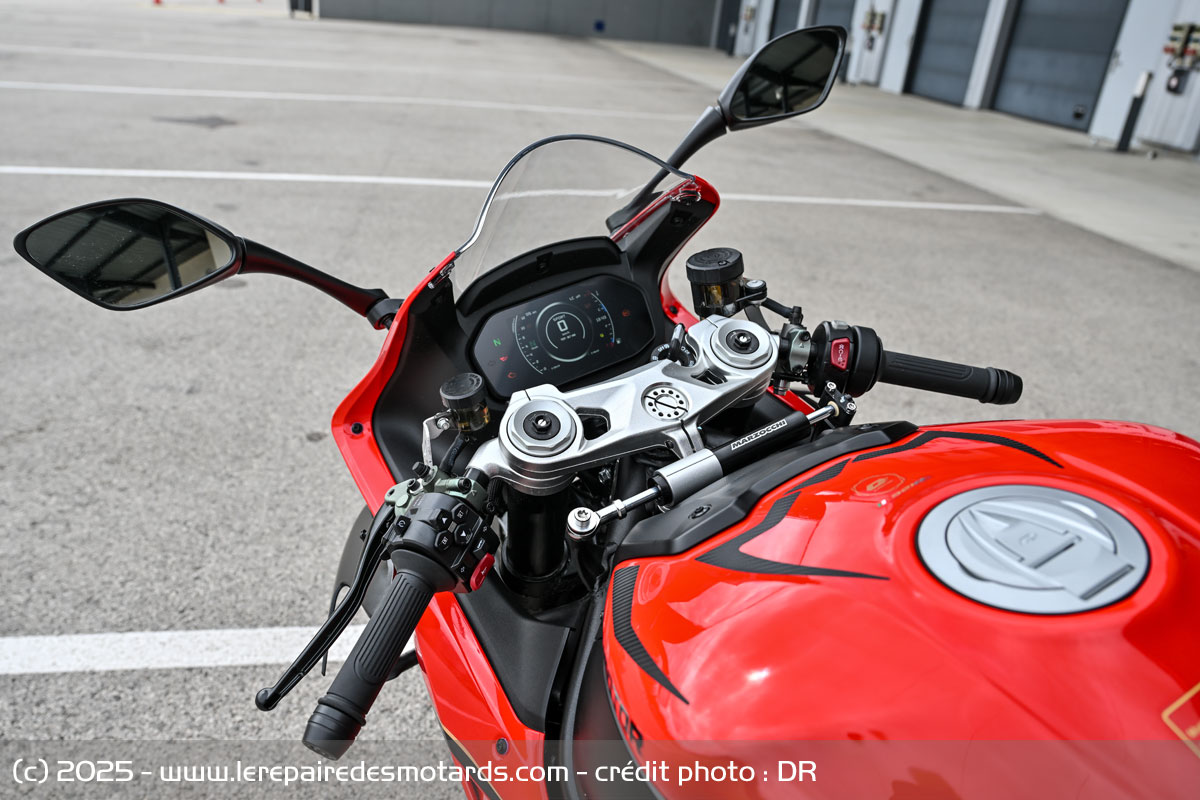 Petite remarque en passant : le maître-cylindre de frein radial, fourni par Brembo, semble être un PR 19. On en retrouve donc l’excellent toucher de levier (réglable en écartement) et le plaisir de la finesse de la belle pièce, tandis que le maître-cylindre d’embrayage est hydraulique et de bonne facture. Brembo en apparence, du fait de sa similarité en tout point avec l’élément de la marque italienne, il est en réalité une bonne réplique (à la finition légèrement inférieure) proposant là aussi un réglage d’écartement et affichant une certaine fermeté. Les commandes sont fixées sur les demi-guidons par une pièce à la couleur différente de celle du corps des maîtres cylindres. Là encore, une source d’économies et un détail portant à sourire.
