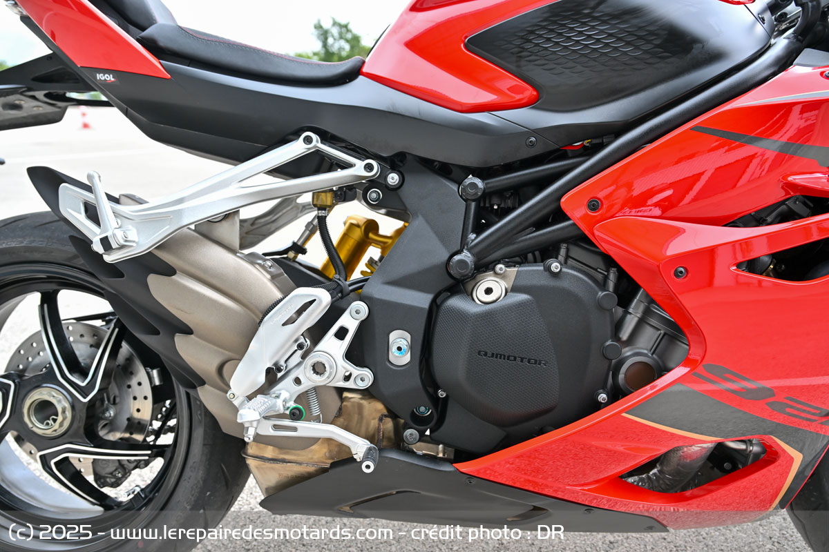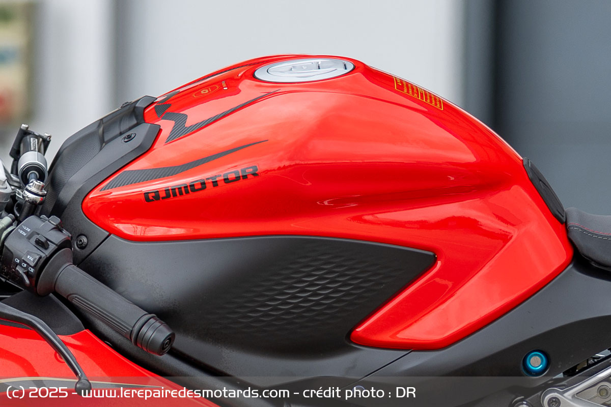 N’y allons pas par quatre chemins : si le moteur avait initialement été évoqué lors des salons moto avec une puissance de 160 ch, il n’en reste « que » 130 aujourd’hui à 10 000 tr/min, c’est à dire la cylindrée et peu ou prou la puissance d’une Brutale 920, mais obtenue avec un alésage course de 78x48,2 au lieu de 73x55 mm sur « l’ancêtre ». Curieux. Une valeur de puissance à rapprocher du poids conséquent de 223 kg tous pleins faits de la QJMOTOR. Le poids, dernier axe d’amélioration sur lequel les motos chinoises haut de gamme semblent avoir à travailler et source de coût supplémentaire : plus c’est léger sur la balance, plus c’est lourd sur l’addition, comme chacun le sait. On est du coup loin du rapport poids puissance d’une hypersportive moderne de 210 ch (minimum...) pour moins de 200 kg et plus de 20 000 €… Intrigante, donc, cette production, dont on aimerait bien savoir à quoi et à qui elle se destine et surtout pour une moto ayant les atours et l’ergonomie d’une sportive, la masse d’une routière ou presque, mais avec 16 litres seulement dans le réservoir, tout en restant très « humble » niveau caractéristiques, moins niveau esthétique. À celles et ceux effrayés par les gros chiffres ? Aux amateurs de moto originale et lookée, à n’en pas douter.