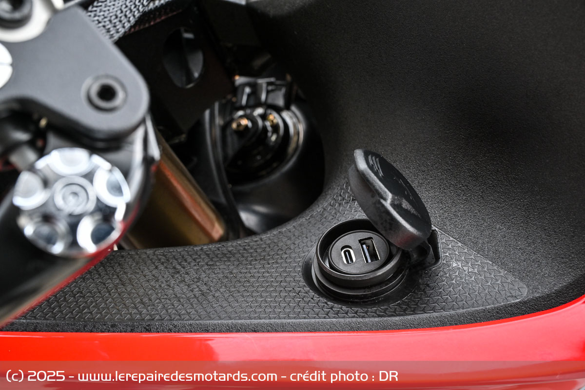 Voici bien une notion quasi absente de la catégorie des sportives. Cette moto ne fait pas exception à la règle, tout en proposant une prise USB de recharge pour prise USB A ou USB C et d’une puissance 20W. Dommage que son emplacement soit juste sous le bracelet droit, impliquant d’avoir une prise compacte pour ne pas entrer en conflit avec le guidon. Par ailleurs, on retrouve des caches en ABS rigide sur les carters moteur, faisant office de protection. La « selle » passager peut être enlevée en l’ouvrant avec la clef de contact et grâce à la serrure située au niveau du flanc gauche. Encore moins de place sous la selle que dessus…. On se doutait bien ne pas pouvoir mettre grand-chose là-dessous.