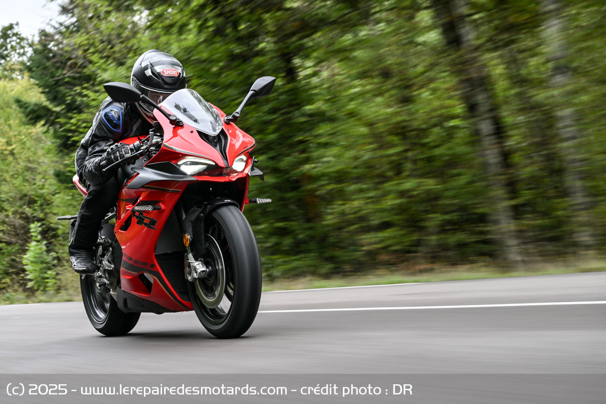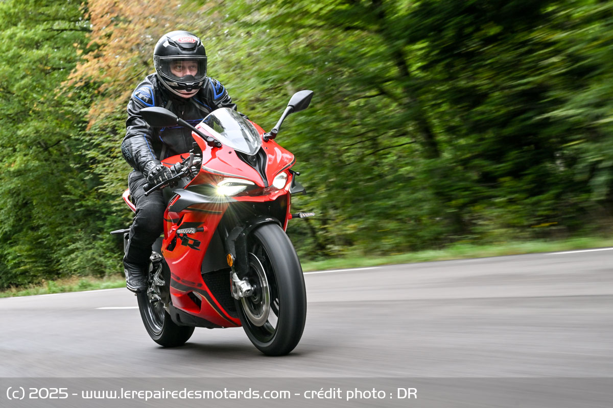 Tout relatif, le confort, sur cette moto ! La protection offerte par la bulle et le carénage avant est correcte, tandis que les suspensions se montrent naturellement fermes dans leurs réactions. Reste une mousse de selle de bonne densité et plutôt accueillante, dont on devine qu’elle sera suffisante pour une portion de route de 50 à 100 km avant de rappeler que l’on se trouve sur une sportive. Heureusement, la possibilité est donnée de se reculer pour profiter d’un accueil de taille supérieure et d’une mousse plus efficace.