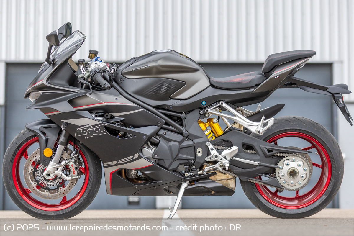 Paradoxale, donc, de qualité niveau finition, elle laisse apprécier son freinage au top et son moteur enthousiasmant, séduit par sa ligne tout en impressionnant par son poids, résolument important, mais pas si gênant. Proposition à part, cette SRK 921 RR a le mérite d’exister et de mettre à portée de bourse et de course une base d’exception, dont on ne sait pas si elle est en mesure de plaire aujourd’hui au plus grand nombre, mais dont on est sur qu’elle perpétue l’esprit d’une marque aujourd’hui en difficulté et souvent inaccessible, victime de ses tarifs et d’une fiabilité discutable : MV Agusta. Alors, pourquoi et surtout pourquoi pas ?