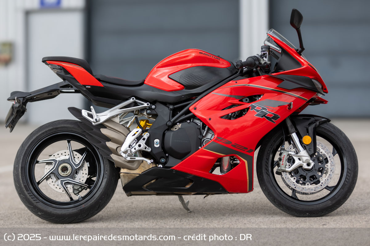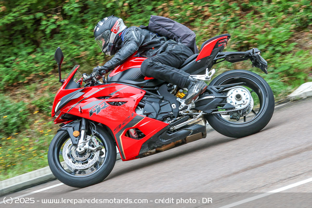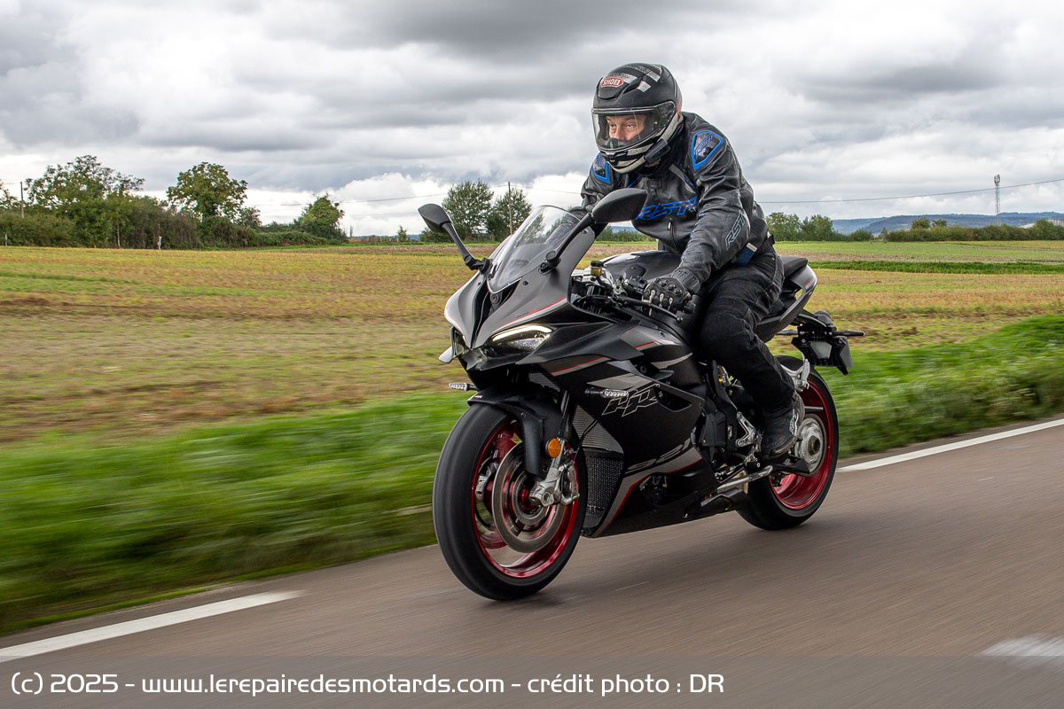 Sous forme de prise de contact effectuée aux alentours de Beaune, sur les terres de la Sima, importateur de QJMOTOR pour la France, j’ai pu profiter diversement et en totale autonomie de cette moto assurément pas comme les autres. La SRK 921 RR affirme ses différences et invite à un voyage dans le temps (époque MV Agusta des années 2010) et peut être également dans la fiabilité pour une mécanique italienne de naissance. Cette Sino-Italienne mixe le bon et le surprenant, déroute et séduit pourtant au fil des kilomètres. Certes, elle n’a rien de facile ou d’évident, mais sa simplicité à rebours des coûteux standards actuels et ce qu’elle propose, notamment un tarif de 13 499 €, ont de quoi plaire aux amateurs de moto de grosse cylindrée ne souhaitant pas débourser plus pour des chevaux qu’ils n’utiliseront pas et pour une technologie qu’ils n’utiliseront pas ou désactiveront. Voici donc ce qu’il en coûterait aujourd’hui de laisser faire le poignet droit, un cerveau et de bons pneus pour rouler sur une moto forte en sensations, en expression et en communication moins cher qu’une 600 Supersport.
