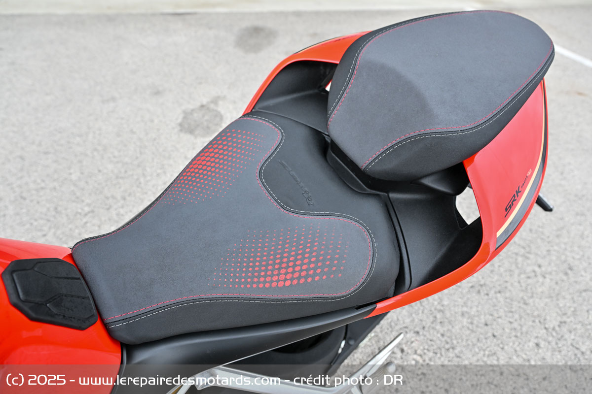 Pas de poignées chauffantes (elles sont cela dit préinstallées, mais pas activées), pas de selle chauffante et un confort de sportive sont donc au programme de la SRK 921 RR. L’aérodynamique vient au secours du corps pour épargner de toute pression d’air excessive, tandis que la position de conduite sollicite les cervicales les plus fragiles et les poignets endoloris. Considérée comme un confort aujourd’hui, la consommation instantanée et l’autonomie restante ne sont pas indiquées et l’instrumentation est assez basique. On profite, par contre, d’un équipement correct.