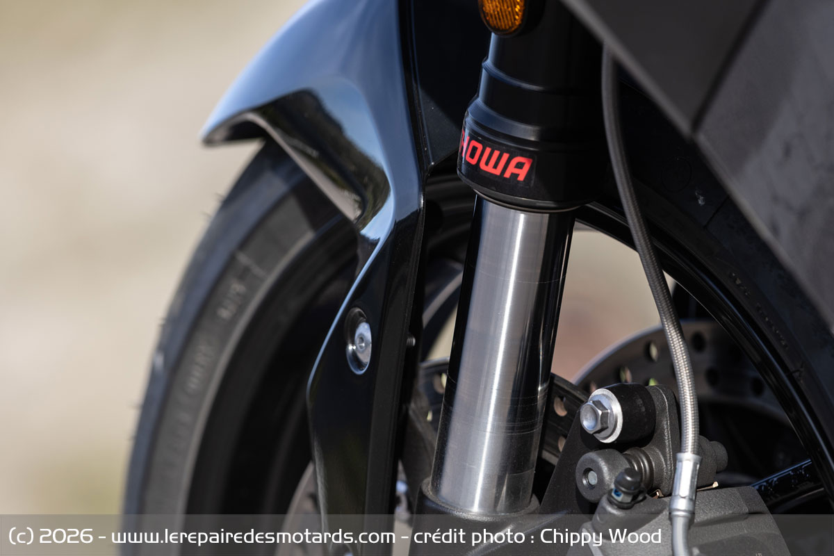 Joliment dessiné, un double bras oscillant acier asymétrique confie ses mouvements sur 150 mm à un amortisseur Showa monté sur biellettes. Bien vu, il est réglable en précharge par molette déportée. Dommage, pas d’ajustement de détente. La fourche inversée SFF-BP (fonction séparée) de 41 mm, non ajustable, débat également sur 150 unités.