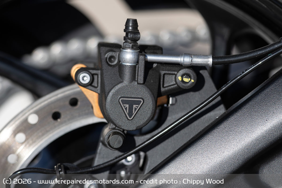 Esthétiquement, le millésime 2026 évolue peu, faisant surtout passer son réservoir de 14,2 à 18,6 litres. Les lignes tendues et volumes étroits composent toujours le style sportif du modèle. Seules les larges écopes modifient discrètement leur dessin d’une échancrure pour plus d’élégance. Autour d’un ajour central, deux feux effilés étirent le dessin la tête de fourche coiffée d’une bulle facilement ajustable sur 80 mm. Accrue, la contenance du bidon donne un peu plus de présence au réservoir de la Triumph. Les angles des épaulements viennent agréablement mourir sur son dos arrondi, devançant la selle monobloc. Encadrée de solides poignées passager, elle repose sur une boucle arrière logeant les discrets systèmes d’accroche intégrés de la bagagerie.