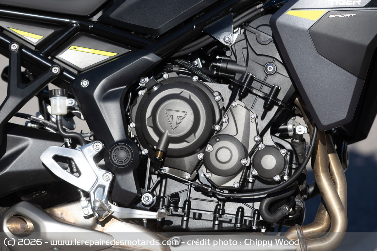 Économie d’échelle oblige, Triumph pose sa nouveauté sur un tout nouveau châssis qui reprend celui des Tiger Sport 800. L’acier compose toujours l’ensemble de la structure tubulaire de la 660. De type périmétrique, l’élément principal intègre évidemment un trois cylindres en élément porteur aux côtes extérieures semblables à celui des 800. Identique mécaniquement à celui de la Daytona, le bouilleur de la Tiger Sport affiche des caractéristiques très proches et cube 660 cm3 (74 × 51,1 mm). Il bénéficie des optimisations de celui de la sportive : nouveau vilebrequin et pistons, profils des cames à hautes levées, large diamètre des soupapes d’admission et boite à air plus volumineuse. De plus, trois corps d’injection de 44 mm gavent désormais le triple. La 660 est également disponible au permis A2 et délivre donc une puissance maximale adaptée. Le bloc sort 95 chevaux à 11 250 tr.min et un couple de 69 Nm à 8 250 tr.min. Des valeurs en hausse, mais à des régimes qui le sont tout autant, notamment le couple. Toutefois, 80% de celui-ci est disponible sur la totalité de la plage moteur. La zone rouge a également été portée à 12 650 tr/min, soit 12,5 % plus haut. De quoi donner une belle vie à ce triple. Notez que la démultiplication finale est en 16 x 51 pour fournir des relances soutenues et profiter de l’allonge moteur.