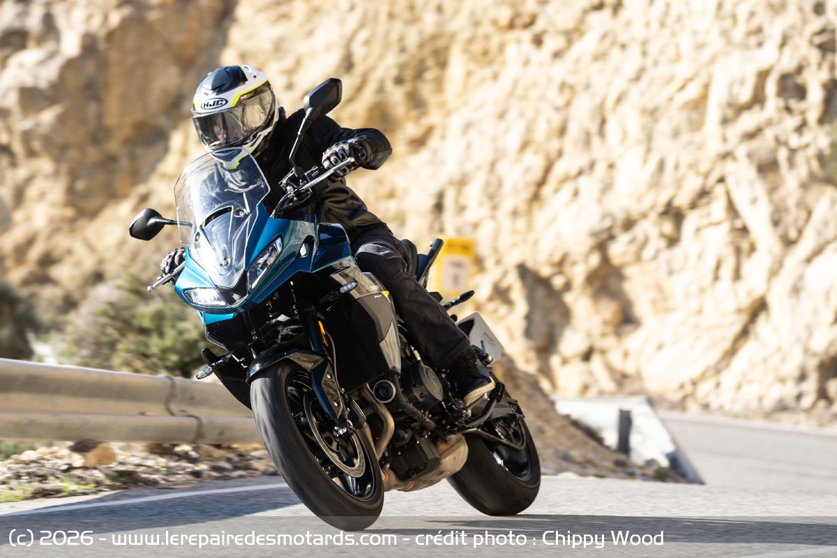 Sur certaines phases transitoires, l’apparition de vibrations dans le guidon et les repose-pieds sont peu gênantes et à peine sensibles à vitesse constante. À 6 000 tours en sixième au légal autoroutier, le confort est bon, mais sur ce rapport un peu long les relances ne seront pas foudroyantes. On rentrera la 5 pour obtenir une vivacité supérieure des relances.