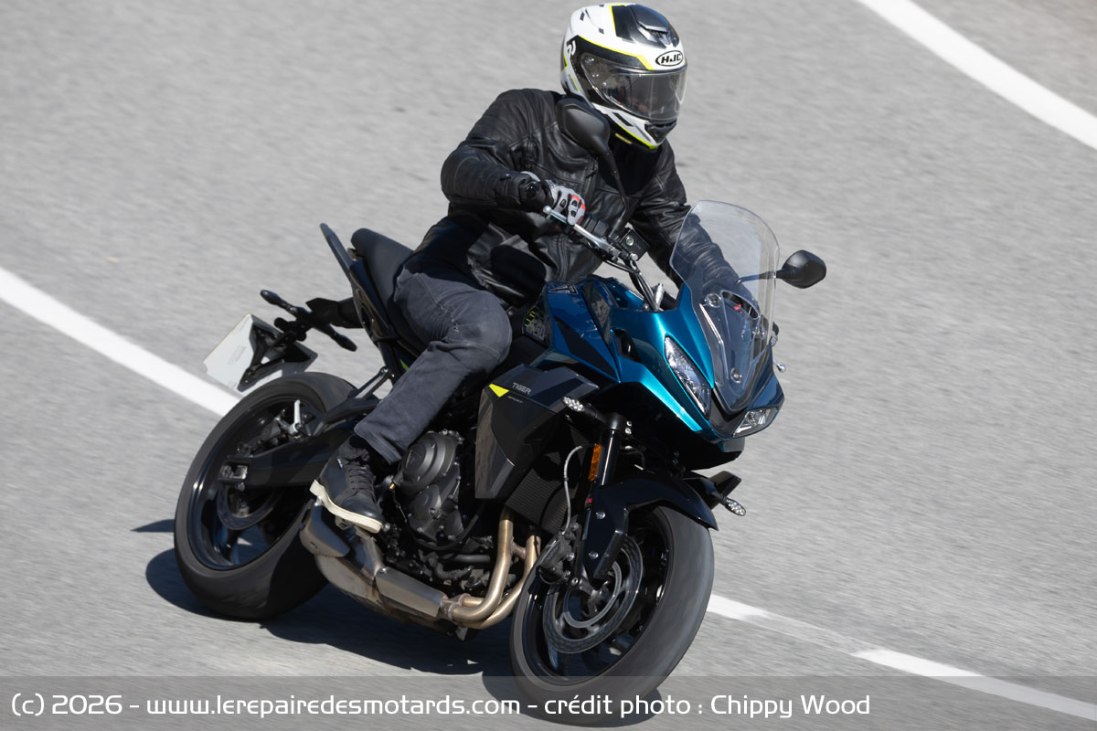 L’hybride routier plonge en virage avec aisance et une mise sur l’angle progressive induite par ses Road 5. Assez ronds, les Michelin s’associent utilement à la géométrie dynamique de la Tiger en limitant la vivacité. Mais, éloigné de l’axe de roue, le pilote n’a pas toujours un franc ressenti du train avant, du fait d’une carcasse de pneu un peu rigide. Toutefois, la stabilité sur les flancs est sans défaut et, dirigé par une triple injection précise, le trois cylindres passe en courbe sur un filet de gaz, sans à-coups. À la relance, cette finesse et l’excellente connexion accélérateur-roue arrière assurent des relances soutenues, sous la surveillance de l’anti-patinage sur l’angle.