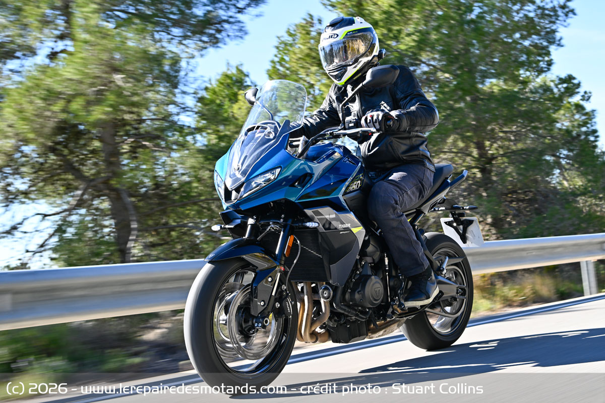 Tout en étant assez vif, l’équilibre de la partie cycle est appréciable. Prévisible et avenante, la Tiger Sport est une moto facile de prise en main. Elle se place aisément dans le trafic et les espaces étroits, aidée par un rayon de braquage correct. Enfin, bien dessinés, les rétroviseurs renvoient un champ suffisamment large, très net et bien dégagé grâce à leur découpe. Bonne mule citadine, l’Anglaise sait aussi partir au loin sans trainer.