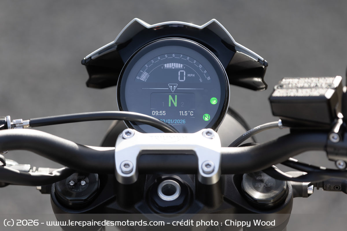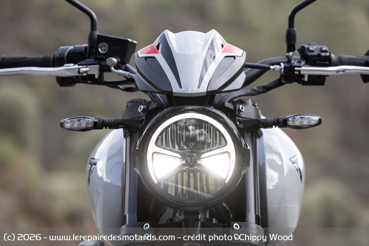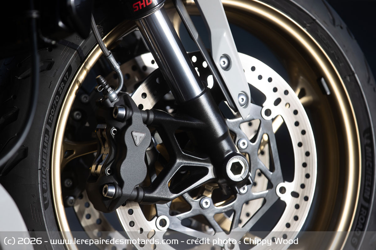 De fait, l’esthétique double bras oscillant acier semi-banane confie ses mouvements sur 130 mm à un amortisseur Showa réglable en pré-charge et détente et monté sur biellettes. La fourche inversée SFF-BP (fonction séparée) de 41 mm est du même fournisseur, désormais ajustable en compression et détente sur le tube gauche et coulisse sur 120 mm. Triumph soigne ainsi davantage l’amortissement de son roadster mid-size.