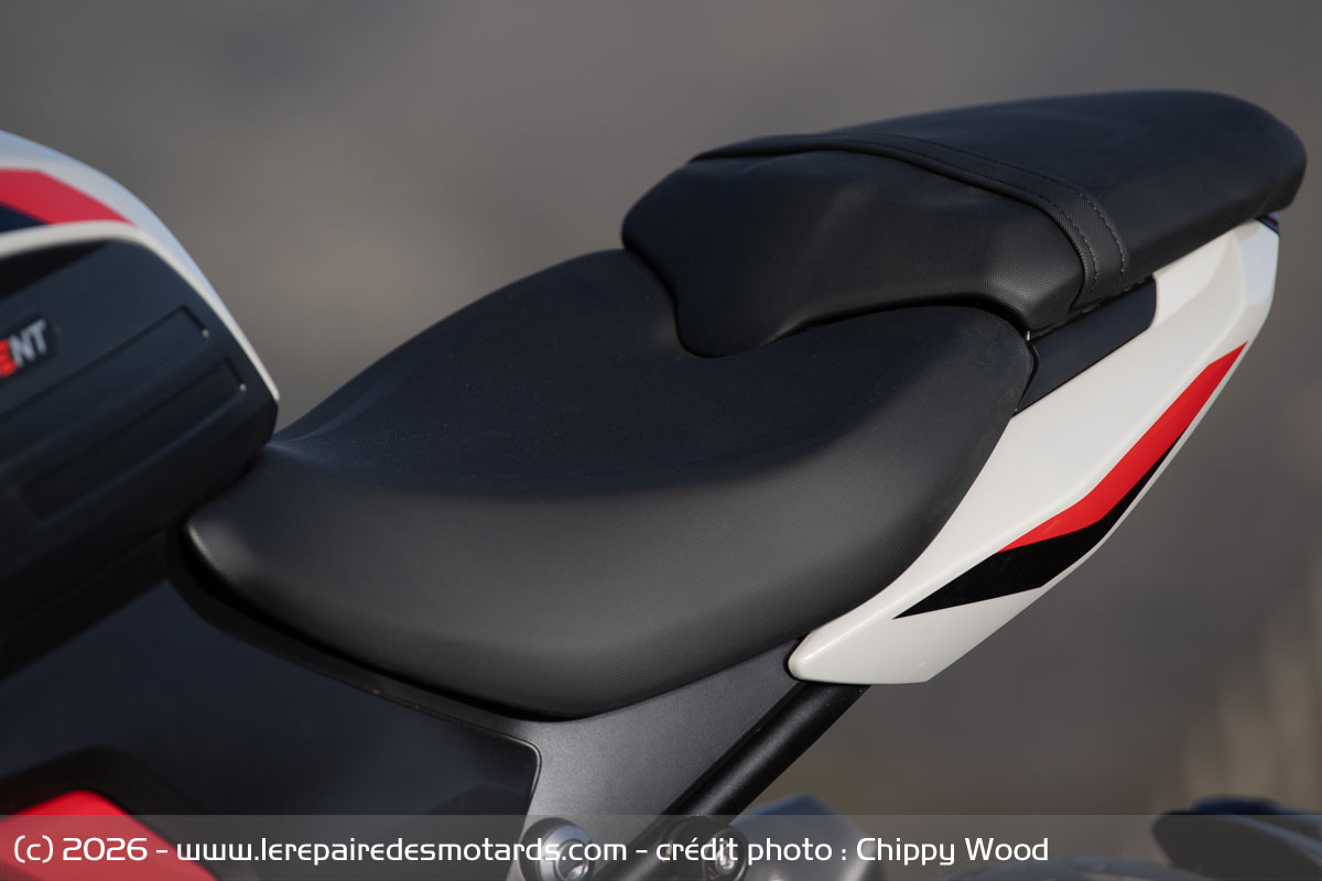 Légèrement reculés, les repose-pieds pilote placés assez bas ménagent une flexion des jambes sans excès, mais suffisamment reculés pour entrainer une légère bascule du buste vers l’avant. Les poignets se trouvent donc en appuis très supportables sur un guidon assez large. Une position idéale pour un bon ressenti du train avant et un éventuel pilotage tonique.