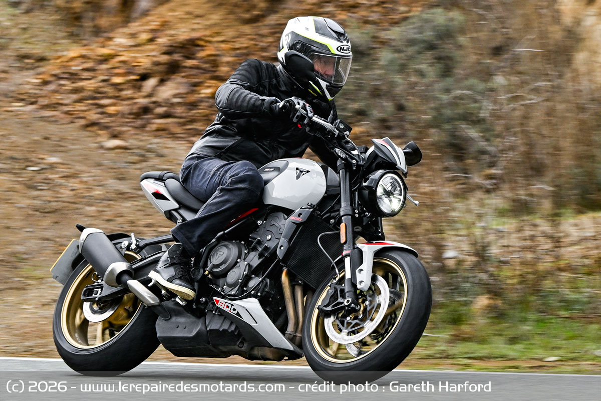 Lancée à bonne allure, il est temps de prendre les freins tout en empilant les rapports sur l’embrayage anti-dribble. Les étriers avant assurent une décélération puissante et modulable à un doigt et leur mise en oeuvre sur l’angle démontre à nouveau la neutralité du train avant. Celui-ci délivre un ressenti sensible du bitume à son pilote, pneus et fourche lisant le sol avec précision. Les fourreaux Showa freinent honnêtement leur course, mais demanderont à être ajustés en hydraulique si l’on roule à très bon rythme. Même constat pour l’amortisseur, dans l’absolu. Car avec un pilotage sans outrance l’ensemble est très convaincant. D’ailleurs, en courbe bosselée, la Triumph ne gigote pas ou peu. Et là encore les Michelin jouent leur rôle en termes de tenue de route. Tant en grip lors de nos conditions de roulage pluvieuses et froides que par leur carcasse et profil qui, sur les flancs, offrent une très bonne stabilité. Millimétrée, l’injection dirige la mécanique avec précision, quel que soit le mode de pilotage engagé. Les différences de réaction sont très nettes. Si « Rain » offre une grande progressivité, « Sport » donne, sans violence, la quintessence du triple d’Hinkley. Sa course légèrement longue lui assure un « gras moteur » appréciable et un caractère enjoué. Vif et ample, il tracte en sortie de virage et passe ses 84 Nm de couple à 8 000 tours sous le contrôle de son anti-patinage sur l’angle. Les jeux du cirque peuvent se poursuivre, l’Anglaise ne finira pas sur le sable.