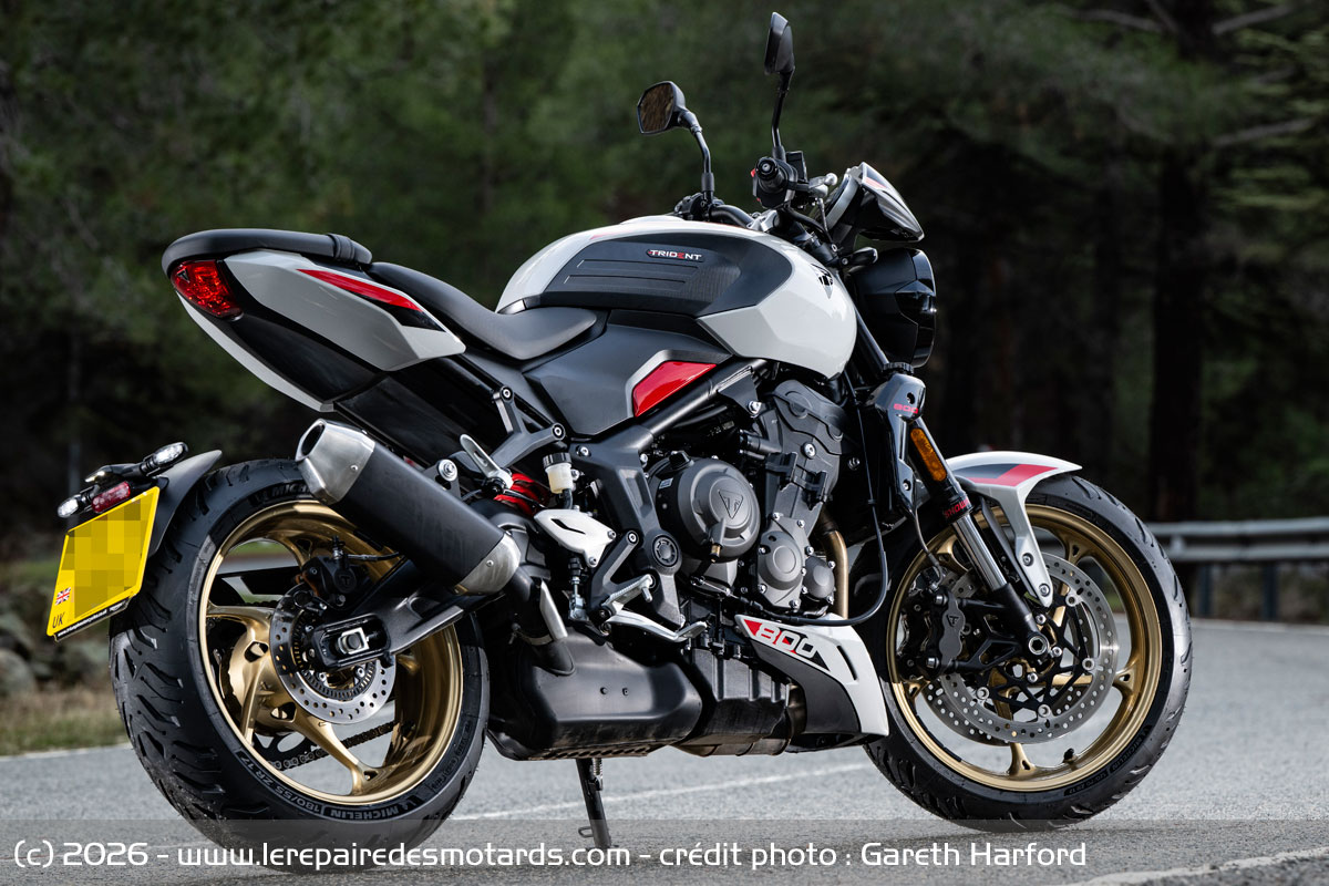 Le souffle de la Trident fuse dans un massif catalyseur qui essaye de se planquer tant bien que mal sous la machine. Heureusement peint en noir et bien fini, il se dissimule correctement et optimise le centre de gravité. Également, le silencieux d’échappement, s’il se présente correctement, est sensiblement économique.