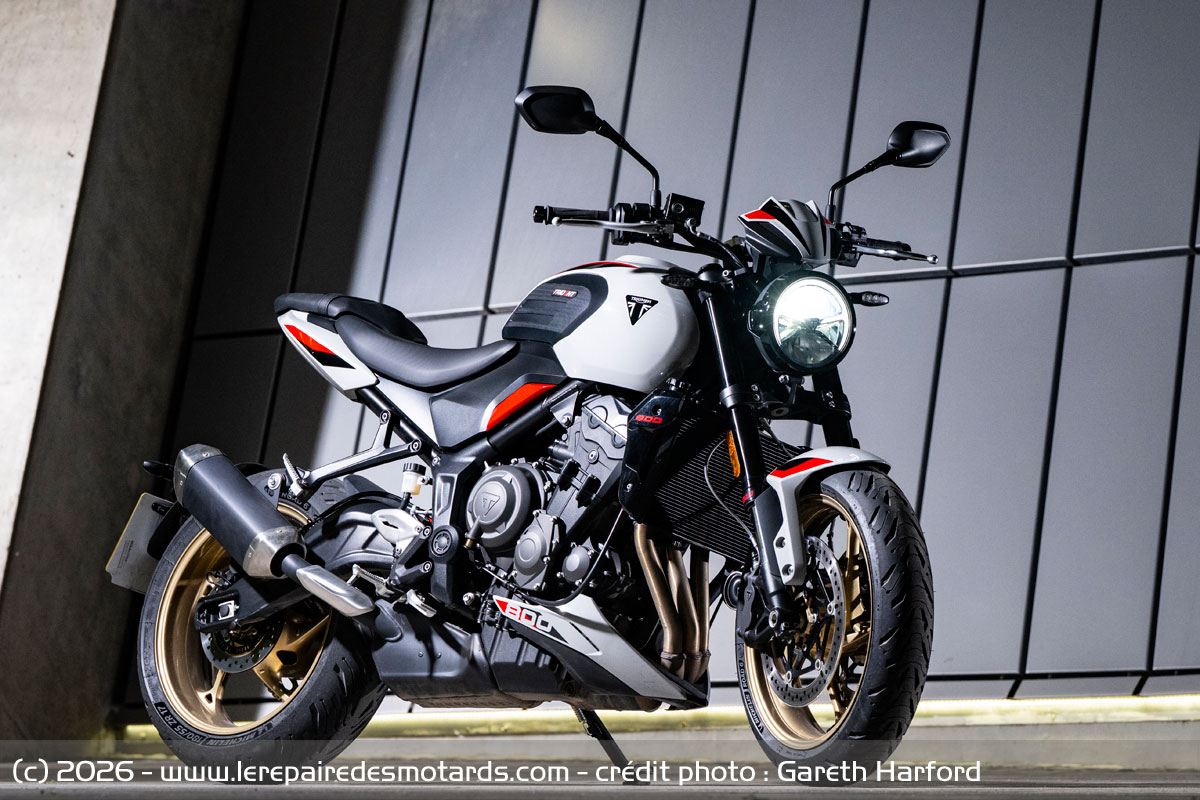Triumph bouscule à nouveau ce segment, dans la catégorie intermédiaire cette fois. Son moteur, implanté dans le trail routier Tiger Sport 800 l’an dernier, est issu de celui de la plus sportive Street Triple 765. La Trident 800 est ainsi le chainon entre l’entrée et le haut de gamme anglais. C’est sur l'île de Chypre que nous étrennons le roadster anglais pour un essai sur des routes aussi contrastées que le fut la météo.