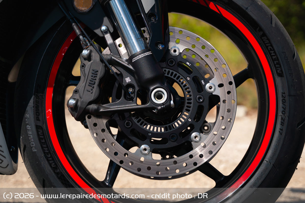 L’amortissement repose sur un ensemble Marzocchi proposant une fourche inversée entièrement réglable de 43 mm de diamètre. Une fois enchâssée dans les tés, elle paraît presque fluette tout en affichant des dimensions et caractéristiques des plus intéressantes. Preuve qu’il ne faut pas se fier à l’emballage, leur efficacité est patente et la plage de réglages est précise, avec plus de 20 positions différentes au niveau des clics de compression et de détente. À noter un débattement de 120 mm seulement au bout duquel nous ne sommes pas parvenus avec les réglages d’origine. Le mono amortisseur arrière est progressif, avec biellette de renvoi et il offre une course de 130 mm. Plus sensible que l’avant, c’est sur lui que l’on peut le plus travailler afin d’améliorer la liaison au sol et de limiter la fermeté importante pénalisante sur route à mauvais revêtement ou en agglomération. Heureusement que les carcasses de pneumatiques sont conciliantes et apportent une bonne dose de confort. Pour rappel, il s’agissait de Michelin Power GP 2 et non des Power 6 normalement montés d’origine pour notre marché. En dimensions standard 120/70 à l’avant et 180/70 à l’arrière, on dispose d’un grand choix de montes tout en constatant que l’arrière est large, afin de favoriser la stabilité observée tout au long de cet essai.